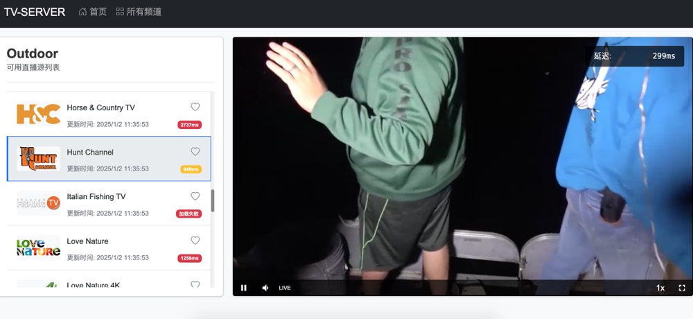 https://pleyr.net/en/play播放界面,左边为频道列表,右边为视频列表 - 在返回m3u8链接列表时,同时返回延迟率信息