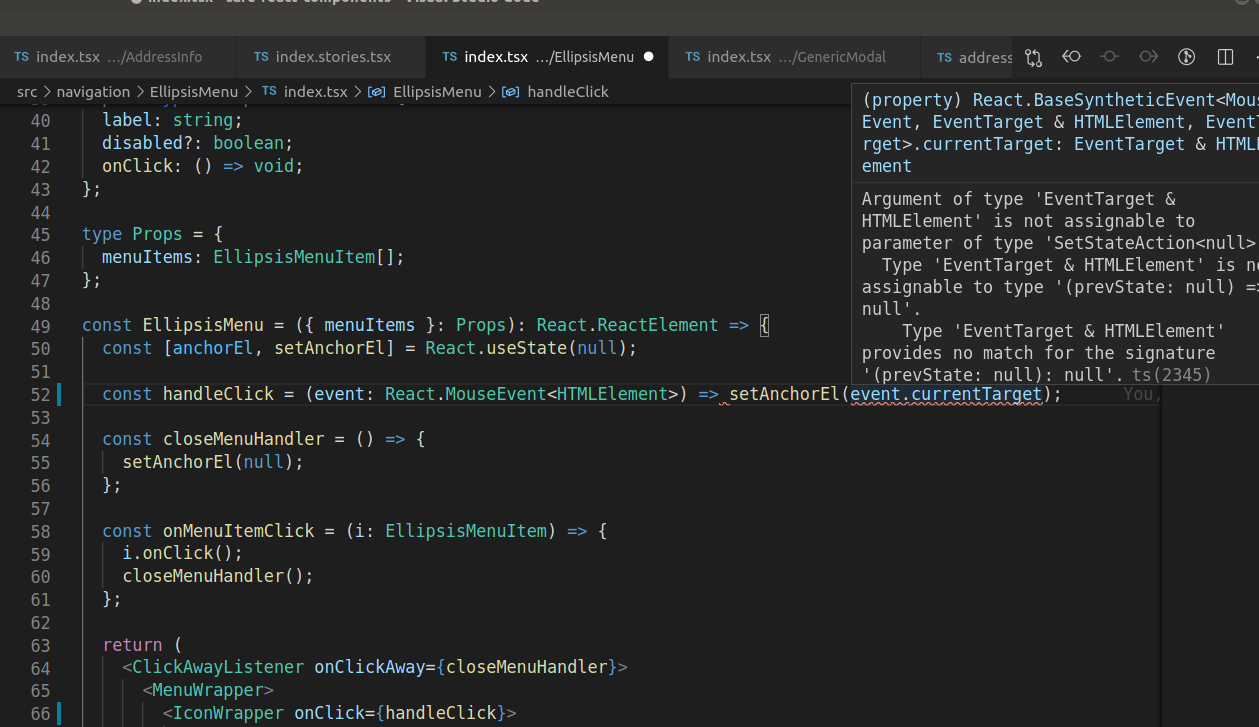 If you read through error message it says that it cannot assign to type of null (which is the inferred type of anchorEl). I already pushed a fix