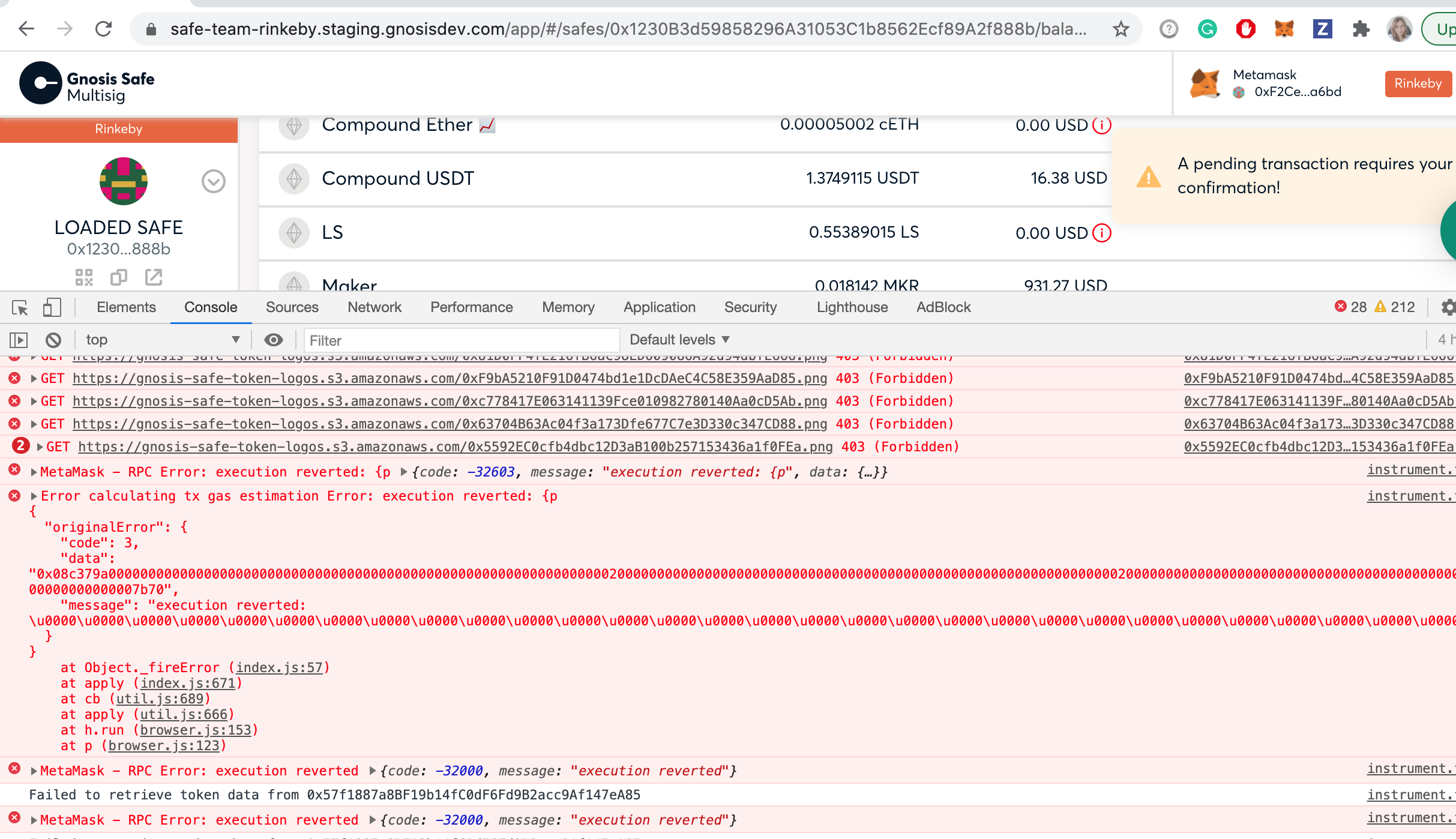 Current result: The transaction is executed but the " Error calculating tx gas estimation" appears in the console