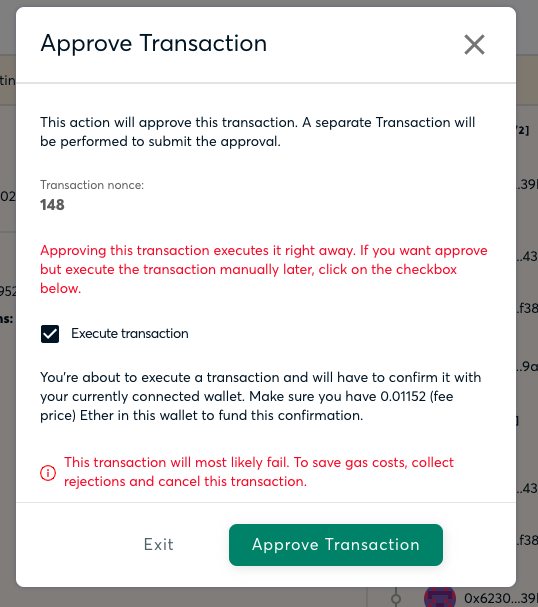 checkIfTxWillFailto show/hide a red warning on theapproveTxModaluseCheckIfTransactionWillFailhook that will receivetxData,safeAddressandtxRecipientand will try to estimate the gas for executing it, in case the returned gas is bellow 0, it will return trueNote: this PR won't add the new signing flow