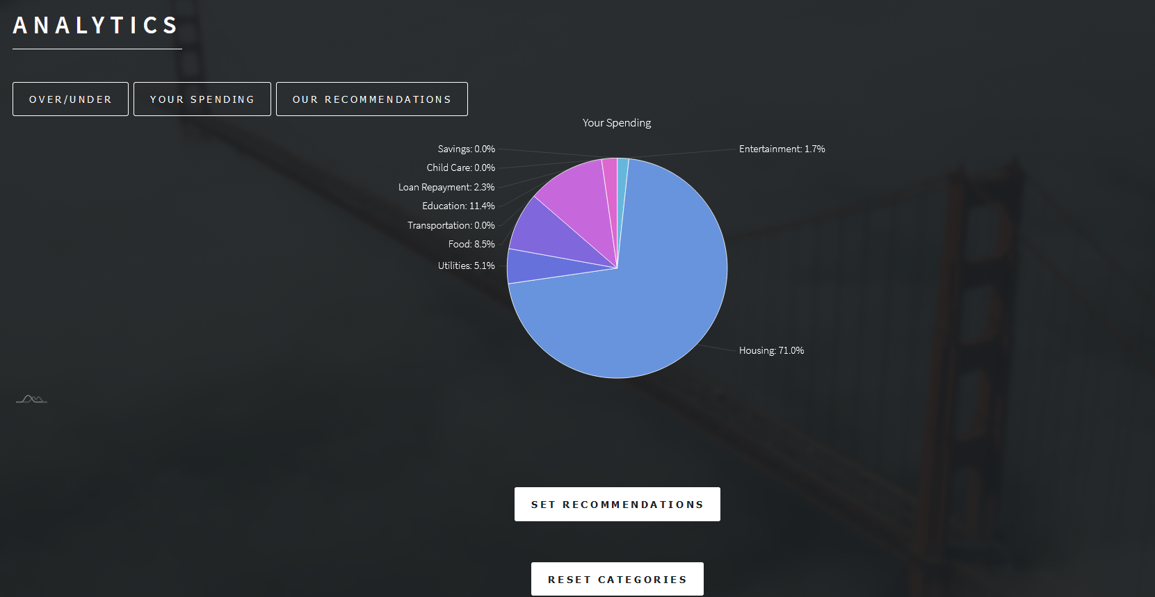 - One over/under display that shows each spending category and whether you went over the recommended amount or not