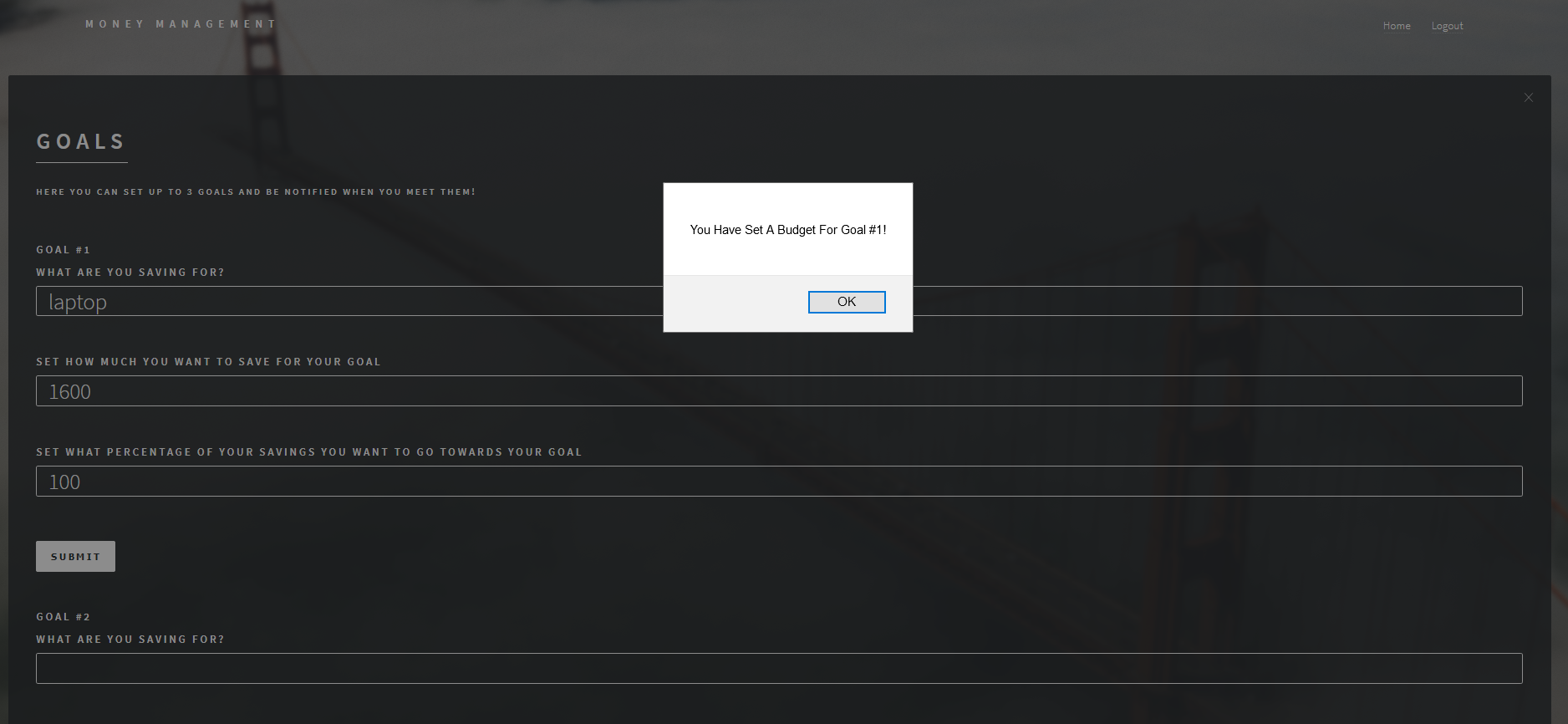 - The user can create up to 3 goals: Goal #1, Goal #2, Goal #3