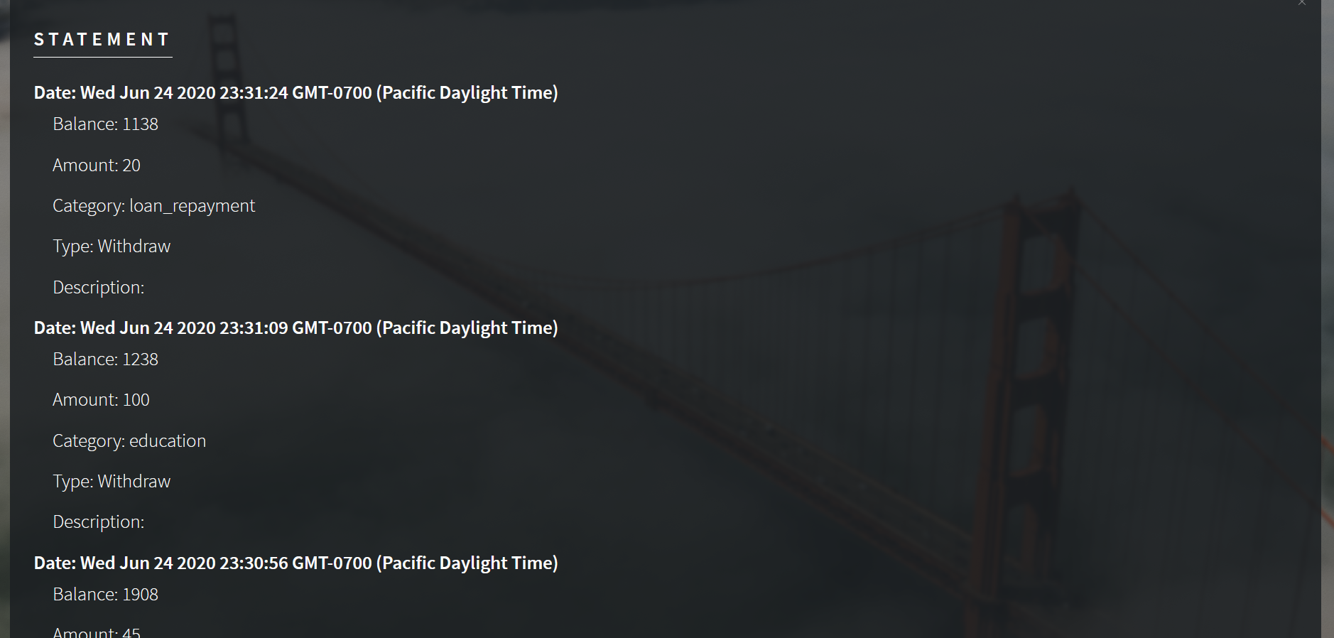 - Keeps a log of each entry to graph out their finances in database. This is shown as statements page similar to bank statement. It shows each date, along with balance amount category type and description.