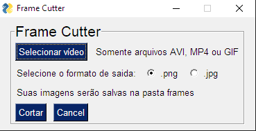 Frame Cutter é um programa executável criado com o proposito de separar os frames de um vídeo, de formato AVI, MP4 ou GIF em imagens no formato PNG ou JPG.
