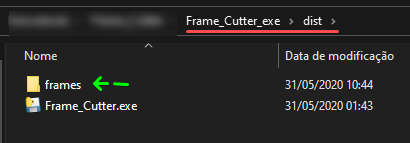 - Ao criar as pastas com o arquivo .exe, você terá de criar uma pasta dentro da pasta dist, pasta esse na qual se encontra o arquivo executável, e nomeá-la de frames para poder salvar os frames do vídeo selecionado.