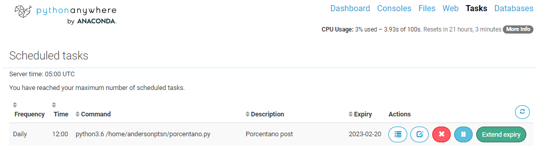 Nele, basicamente, hospedei os arquivos disponibilizados aqui no GitHub e criei uma Tarefa para rodar o script de postagem do Porcentano diariamente.