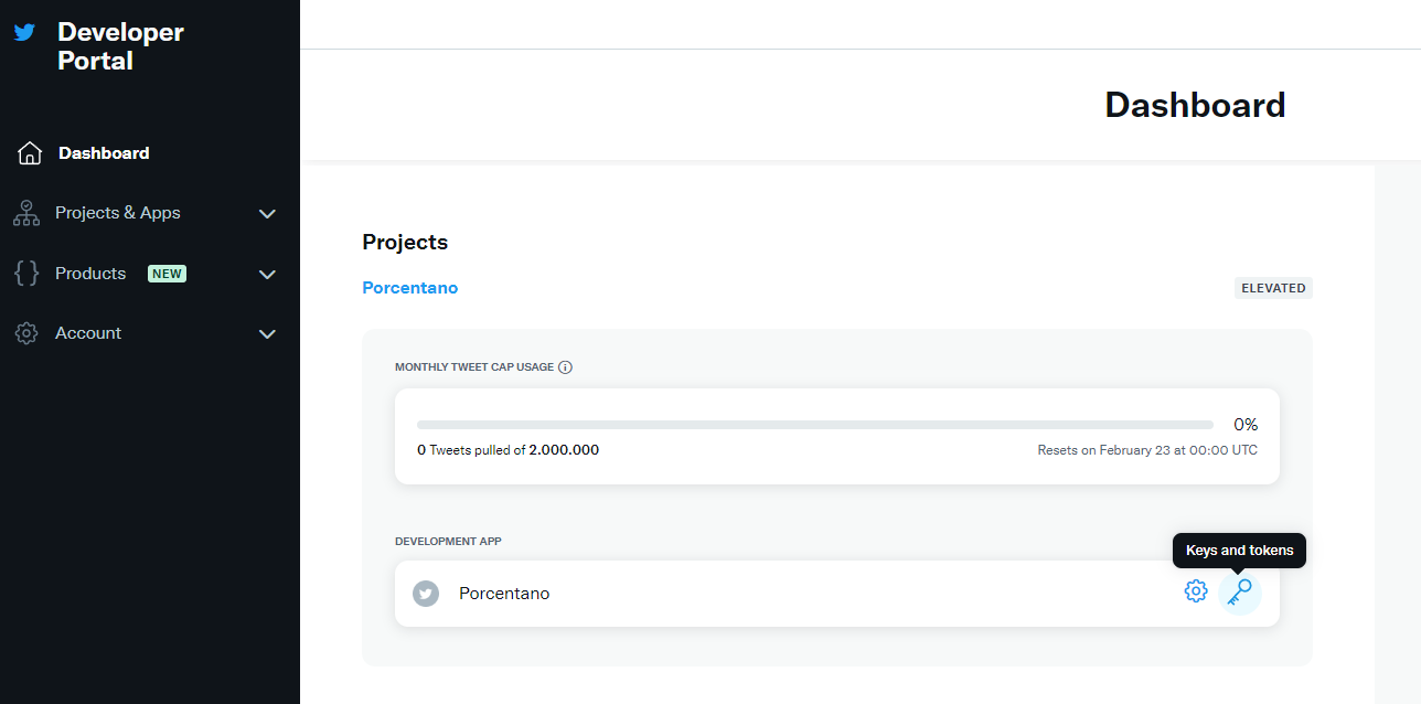 Para começar a utilizar a API do Twitter foi necessário utilizar o portal do desenvolvedor e nele criar um novo projeto, o importante foi que através dele foi criado as chaves e os tokens para a utilização da API, essas chaves eu salvei em um arquivo à parte, para não subirem no GitHub