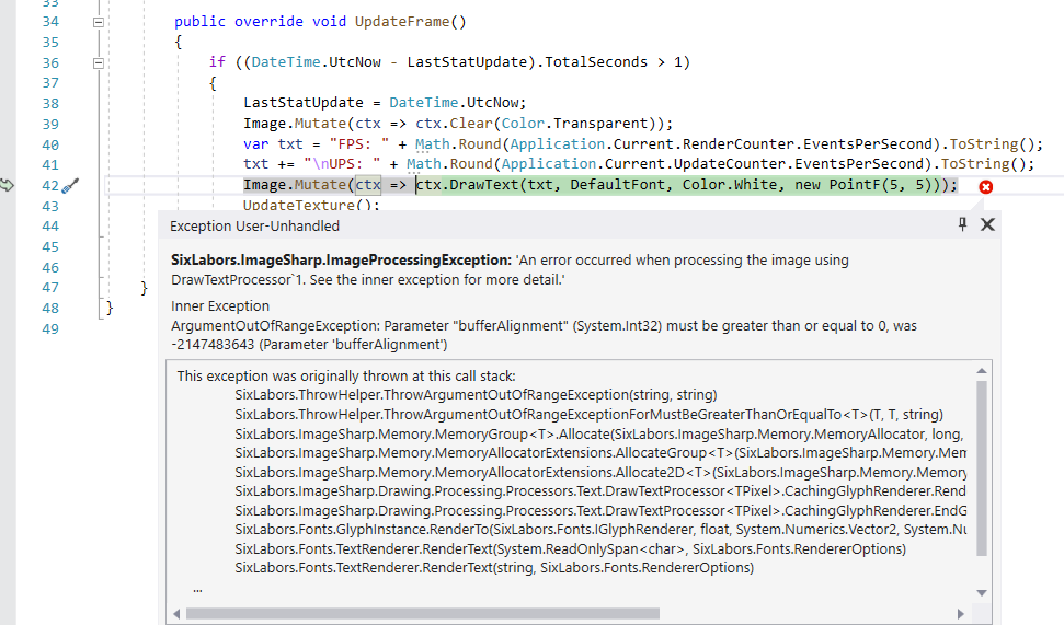 at Aximo.Engine.Components.Geometry.StatsComponent.<>c__DisplayClass4_0.<UpdateFrame>b__1(IImageProcessingContext ctx) in C:\SOFTWARE_LIBRARIES\AxEngineSource\AxEngine\Engine\Components\Geometry\StatsComponent.cs:line 42