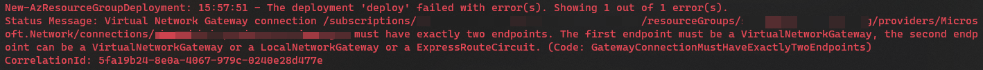 Status Message: Virtual Network Gateway connection /subscriptions/<subscriptionId>/resourceGroups/<resourceGroupName>/providers/Microsoft.Network/connections/<connectionName> must have exactly two endpoints. The first endpoint must be a VirtualNetworkGateway, the second endpoint can be a VirtualNetworkGateway or a LocalNetworkGateway or a ExpressRouteCircuit. (Code: GatewayConnectionMustHaveExactlyTwoEndpoints)