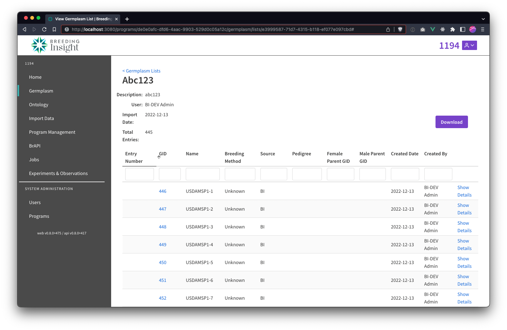 Then view all imported germplasm and use the dev tools console to inspect the germplasm objects in the response from bi-api. Verify the additionalInfo field "listEntryNumbers" exists and the value is a Map with the imported list ID from step 2 as the key and entry number as value.