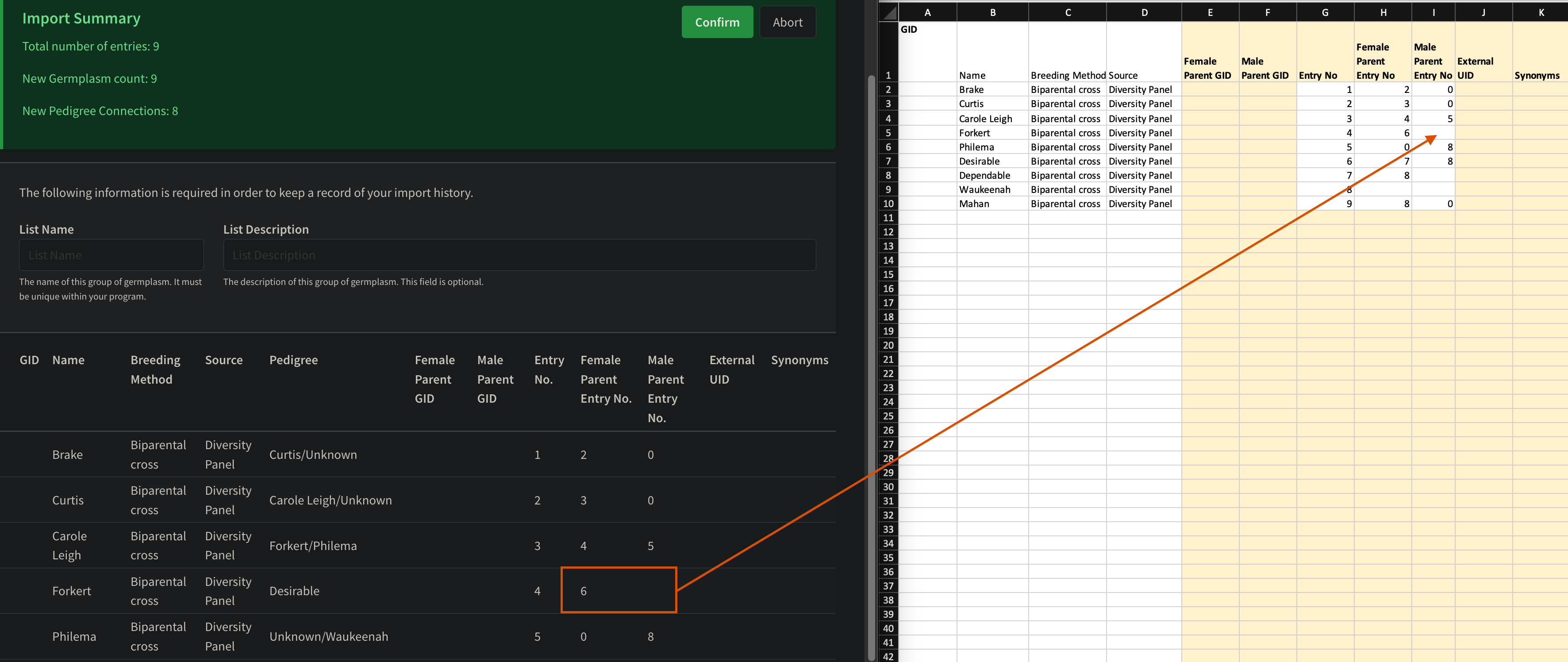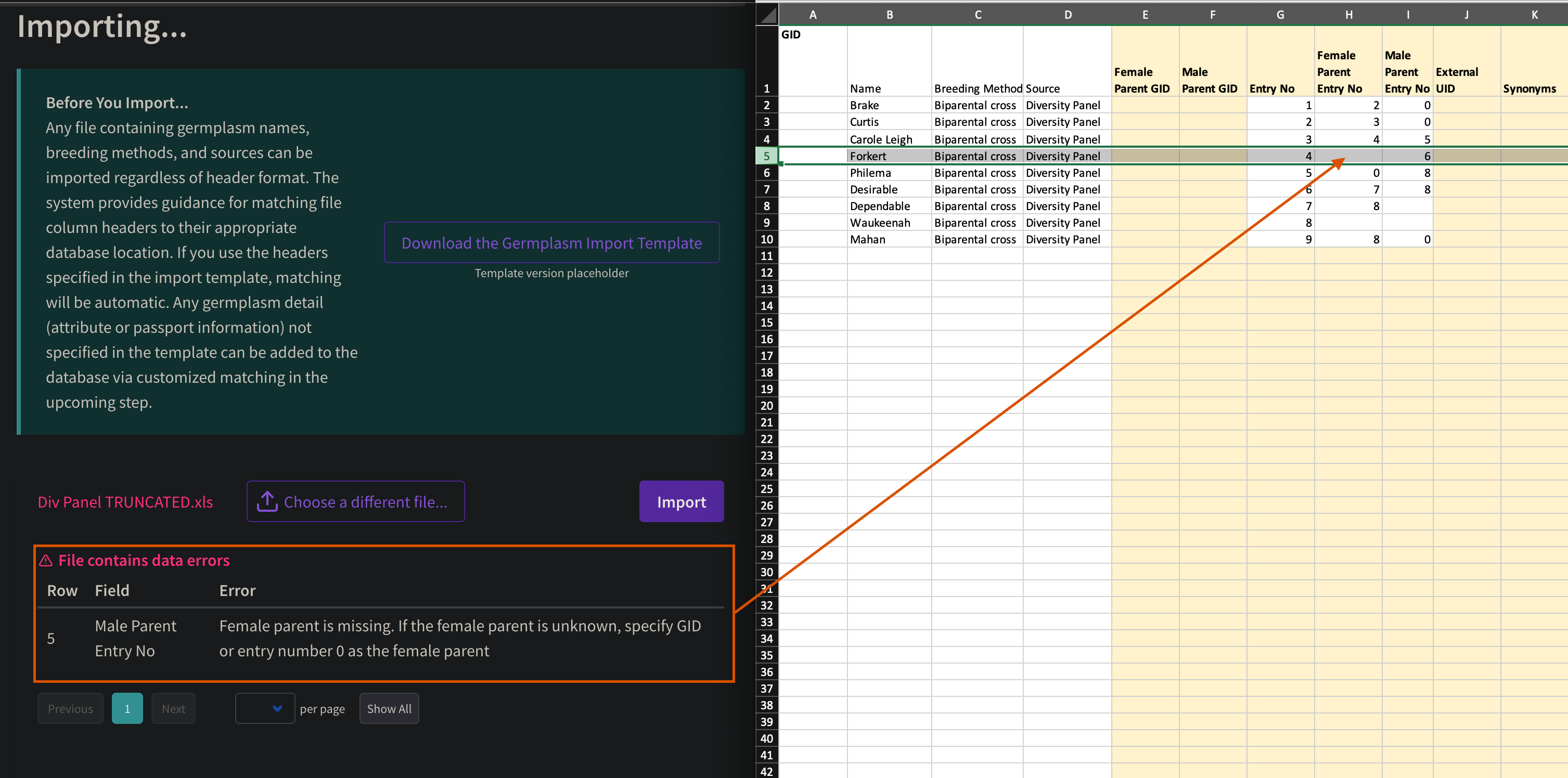 | Has Male Parent Entry No. | Upload Succeeds ✅ | "Female parent is missing..." error message ❌ (first screenshot) |