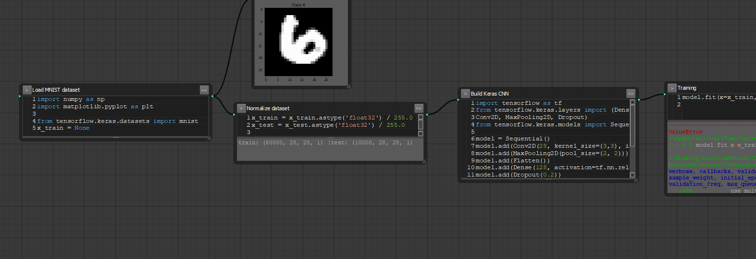 Pyflow ran Load dataset (setting x_train to None) and ran Training (returning an error because x_train is None)