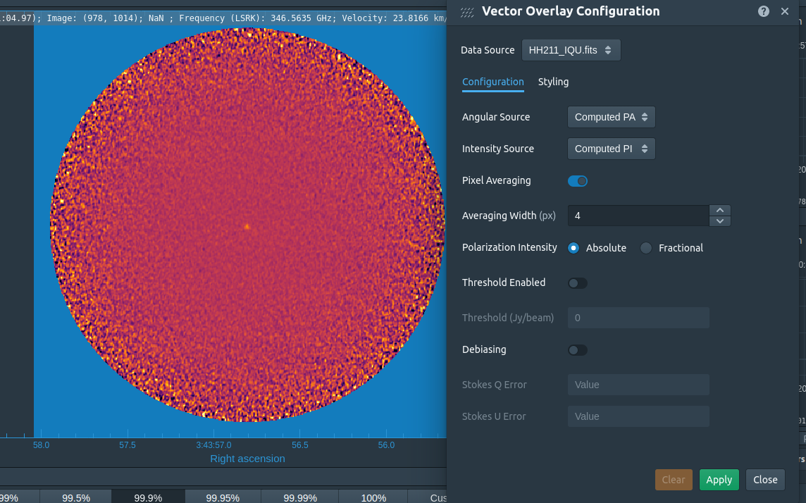 | def configure_vector_overlay(self, angular_source=VectorOverlaySource.CURRENT, intensity_source=VectorOverlaySource.CURRENT, pixel_averaging=4, fractional_intensity=False, threshold=None, debiasing=False, qError=None, uError=None): |