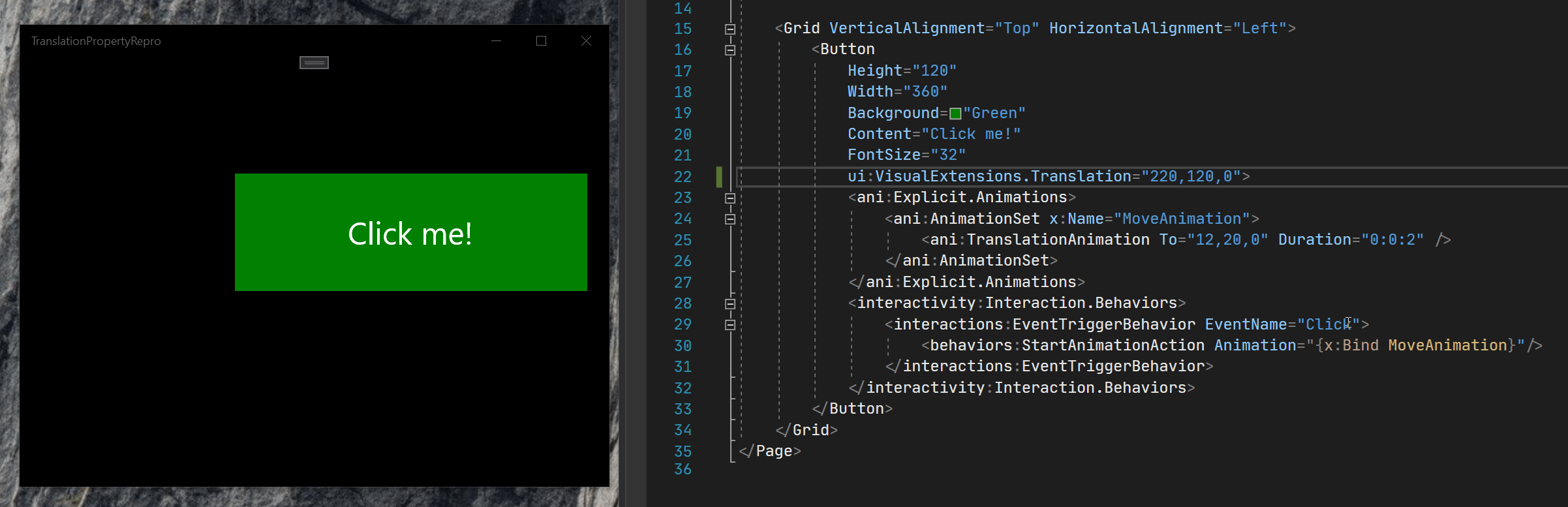 "Translation"property of aVisualbefore an animation, and then the animation is started without an initial value, the animation will just not run. In fact, the"Translation"property won't even be changed at all to the final value of the animation once it completes (though it still takes the expected duration for the animation to complete, it just... Does nothing). This only happens for"Translation", whereas doing exactly the same with eg.Visual.Offsetworks just fine. For instance, consider this repro code:Running this and clicking on the button will have the button remain in the same initial position, and those