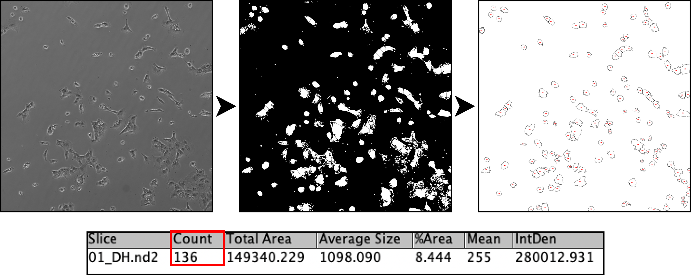Automated quantification of cell number in culture using binary masking, and particle analysis.