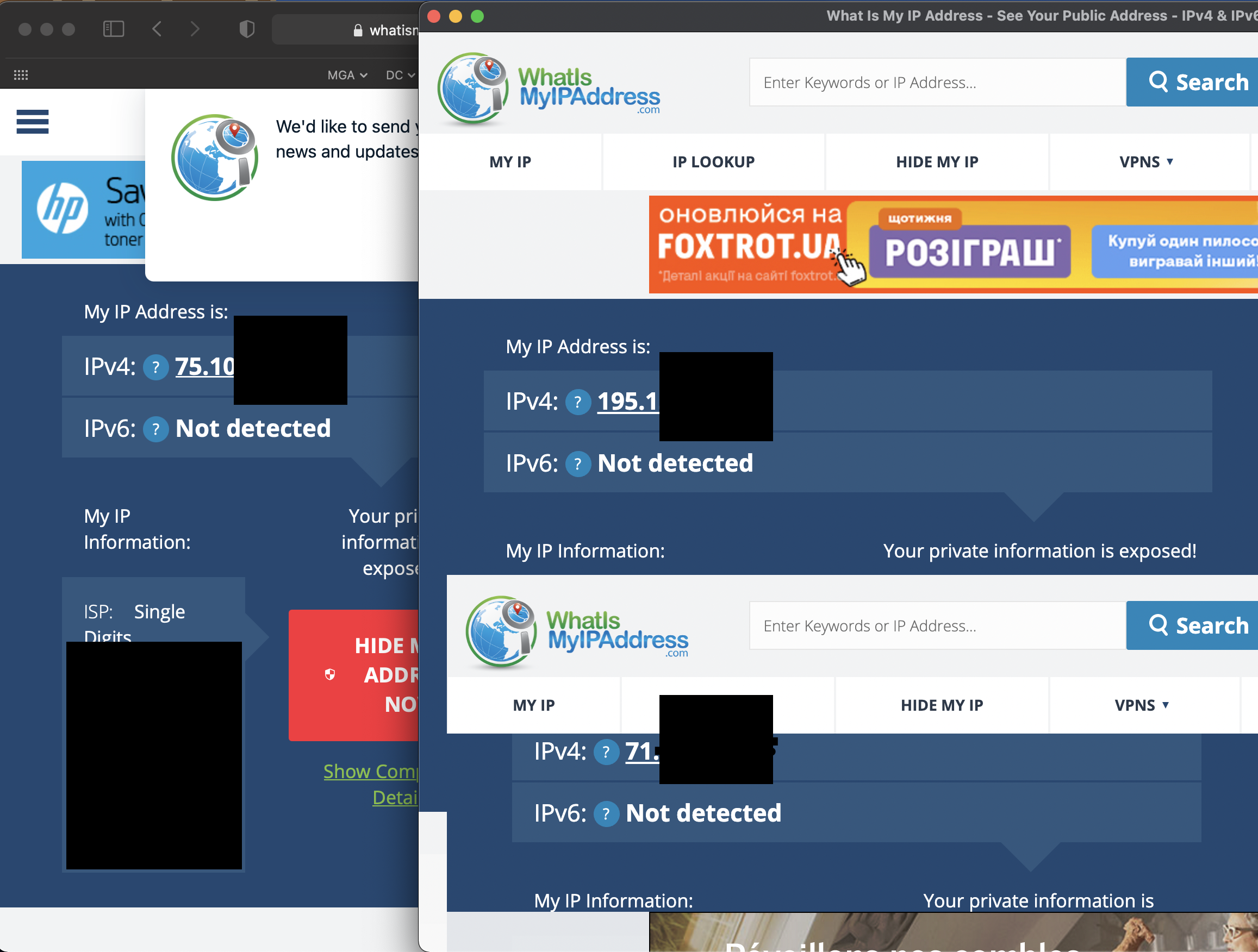 The window on the left is a normal Safari window that contains my actual IP. The window on the right is the Electron window — the top half is the BrowserWindow, and the bottom half contains its embedded BrowserView. Notice that each IP is different because of the proxies supplied to each window.