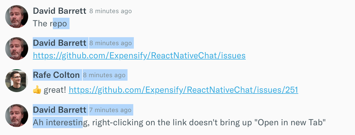 I just dragged my mouse from the middle of "repo" to the middle of "interesting", and see how it skipped over the two posts containing links? What's up with that? Let's make sure all our content is copy-pastable