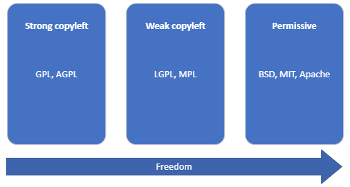 Free open source software licenses vary in the freedoms they grant and the conditions they place on those freedoms. Permissive licenses grant all freedoms with minimal restrictions, usually only requiring attribution. Weak copyleft licenses require derivative works to be made available under the same license, while strong copyleft licenses require the entire derivative work to be released under the same license, creating a risk of loss of IPR and software design investments.