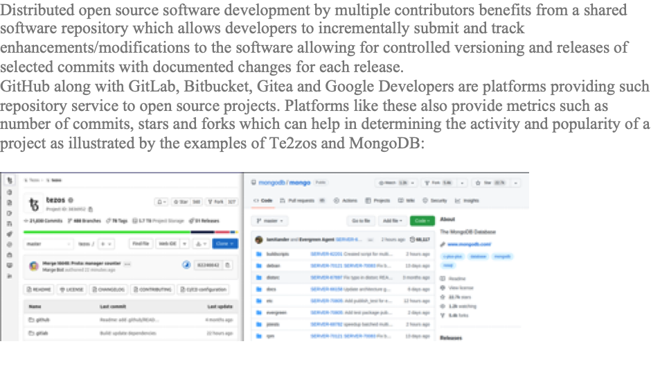 GitHub along with GitLab, Bitbucket, Gitea and Google Developers are platforms providing such repository service to open source projects. Platforms like these also provide metrics such as number of commits, stars and forks which can help in determining the activity and popularity of a project as illustrated by the examples of Te2zos and MongoDB: