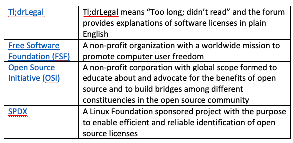 There are commonly used licenses, which after review and approval by the Open Source Initiative, are declared free open source licenses. The SPDX License list provides a comprehensive list of free open source licenses with specific unique and atomized identifiers.