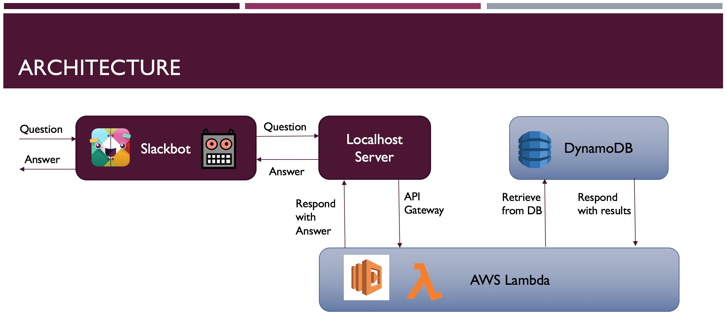 - DynamoDB, API Gateway, AWS Lambda