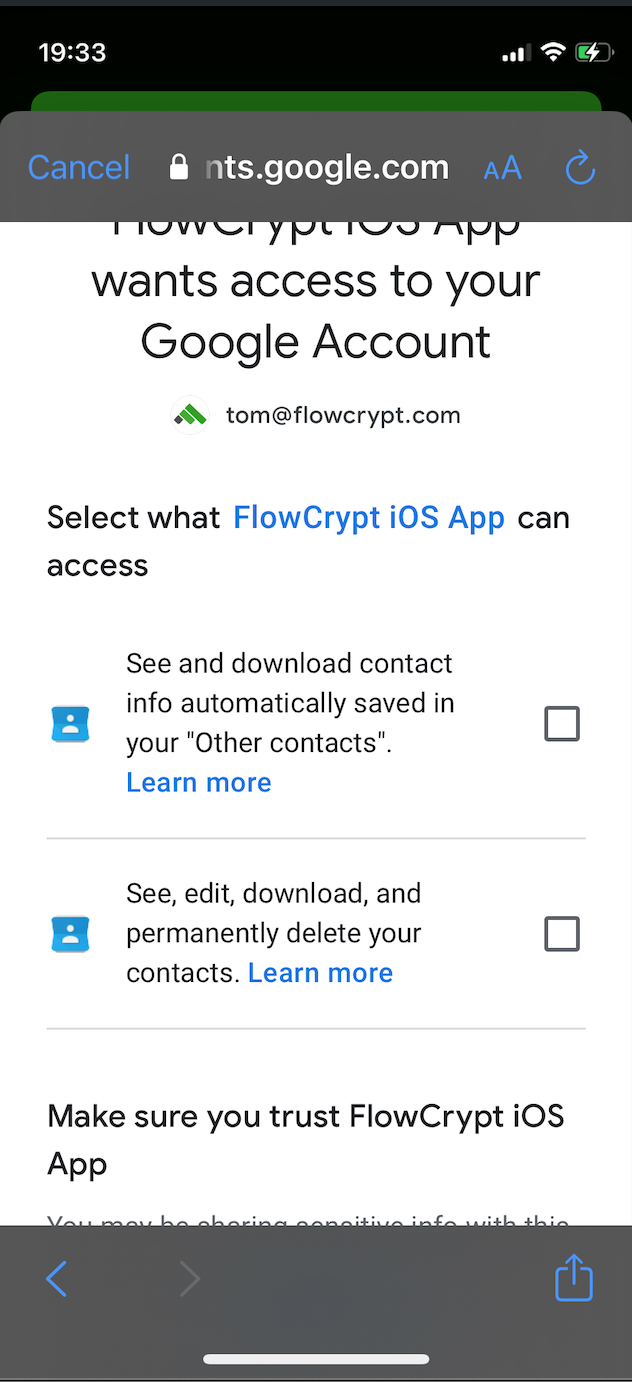 However, on the first prompt it was still showing 3 other permissions + checkbox for Gmail. Could we split it into two steps? In first step, grant 3 other permissions. In second step, grant Gmail (which will then be without checkbox). |