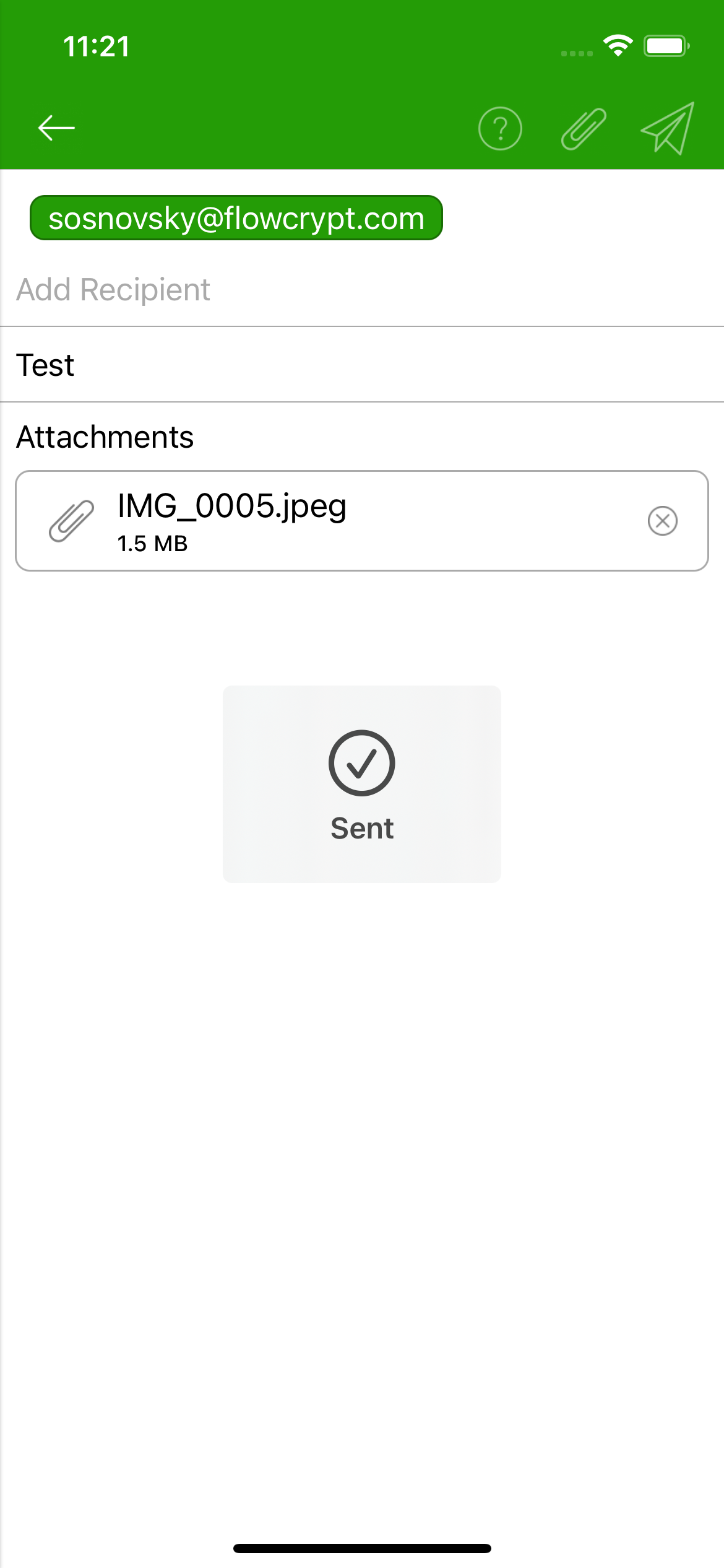 Okay, let's leave it for now, as inbox screen already shows 'Encrypted message sent' popup after message is sent. |