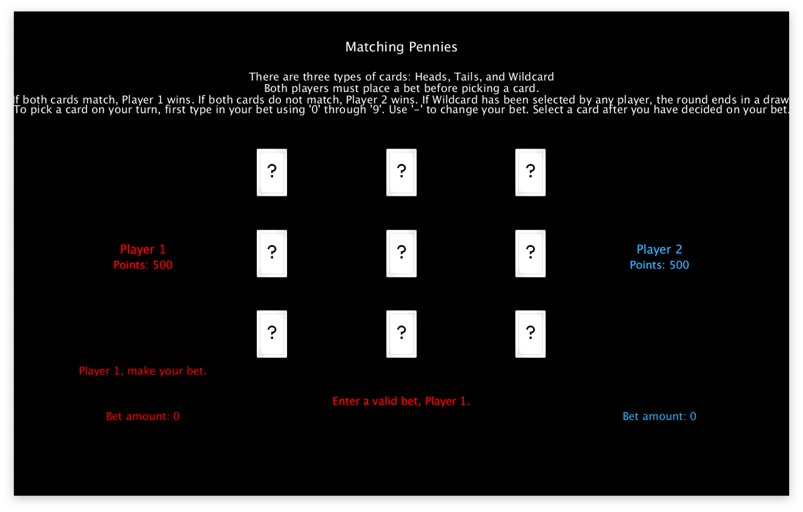 - Two-player game both players each have a penny and choose either heads or tails. Both players reveal their pennies simultaneously; if they match, player A wins; if they don't, player B wins.