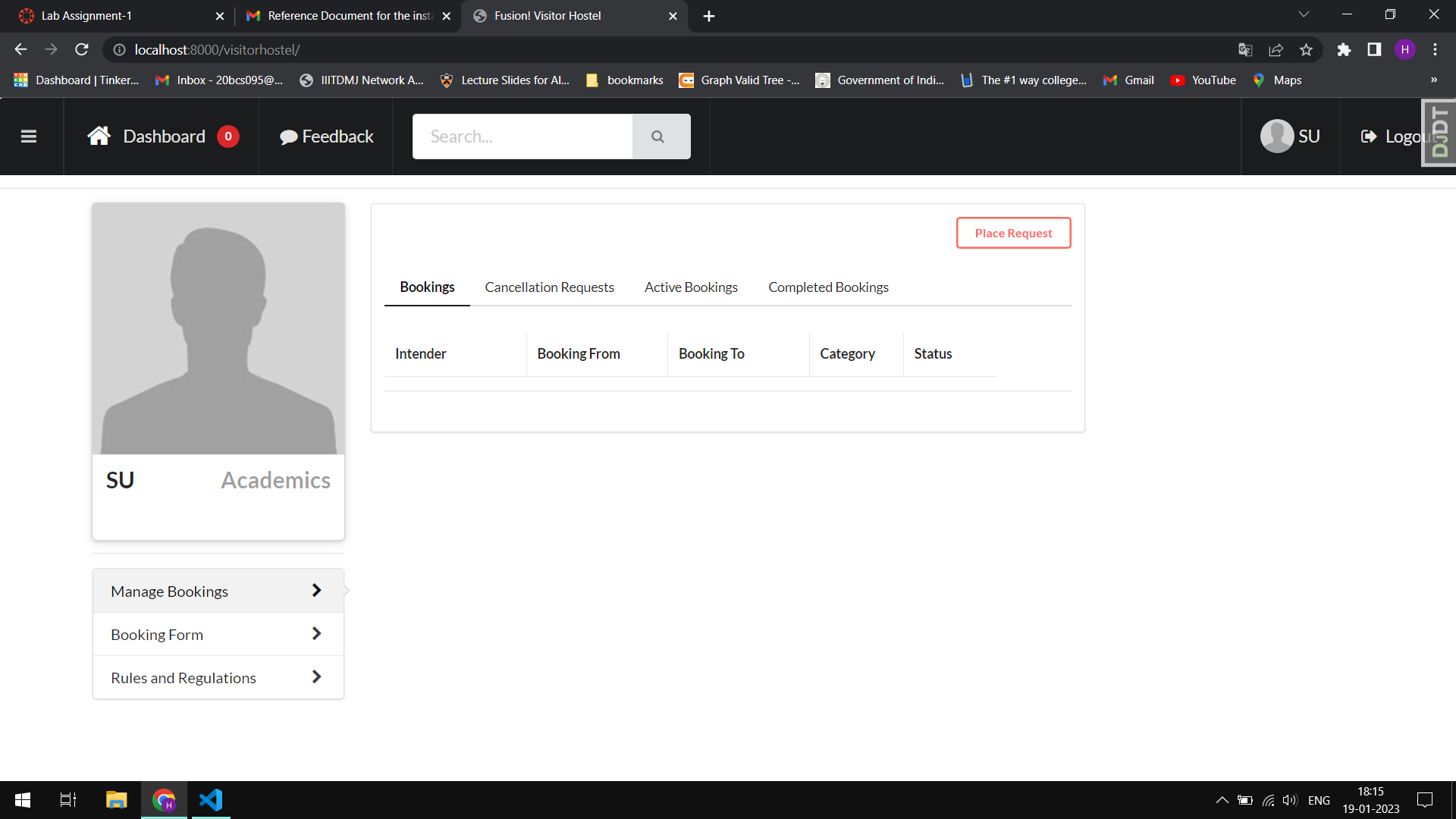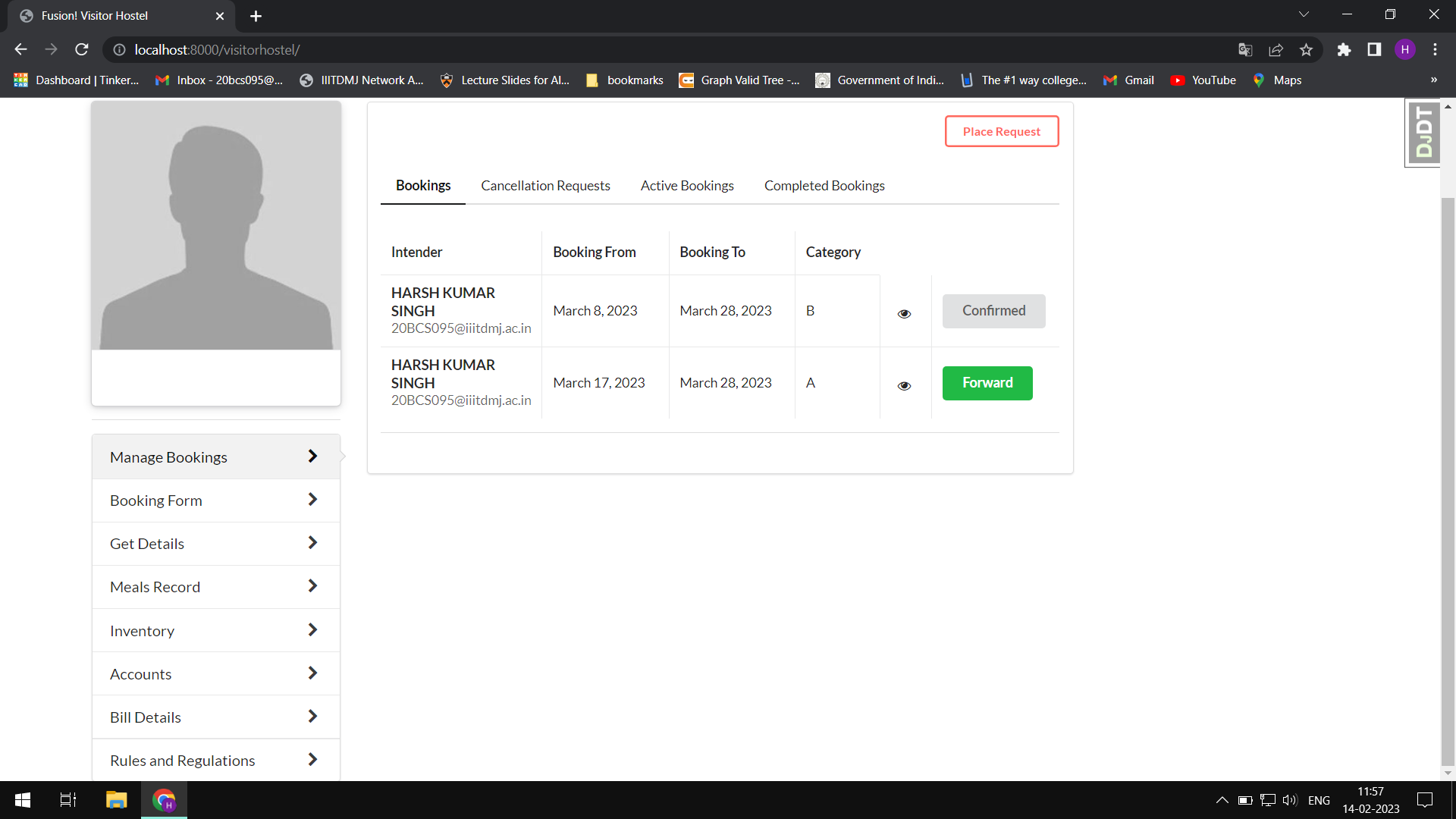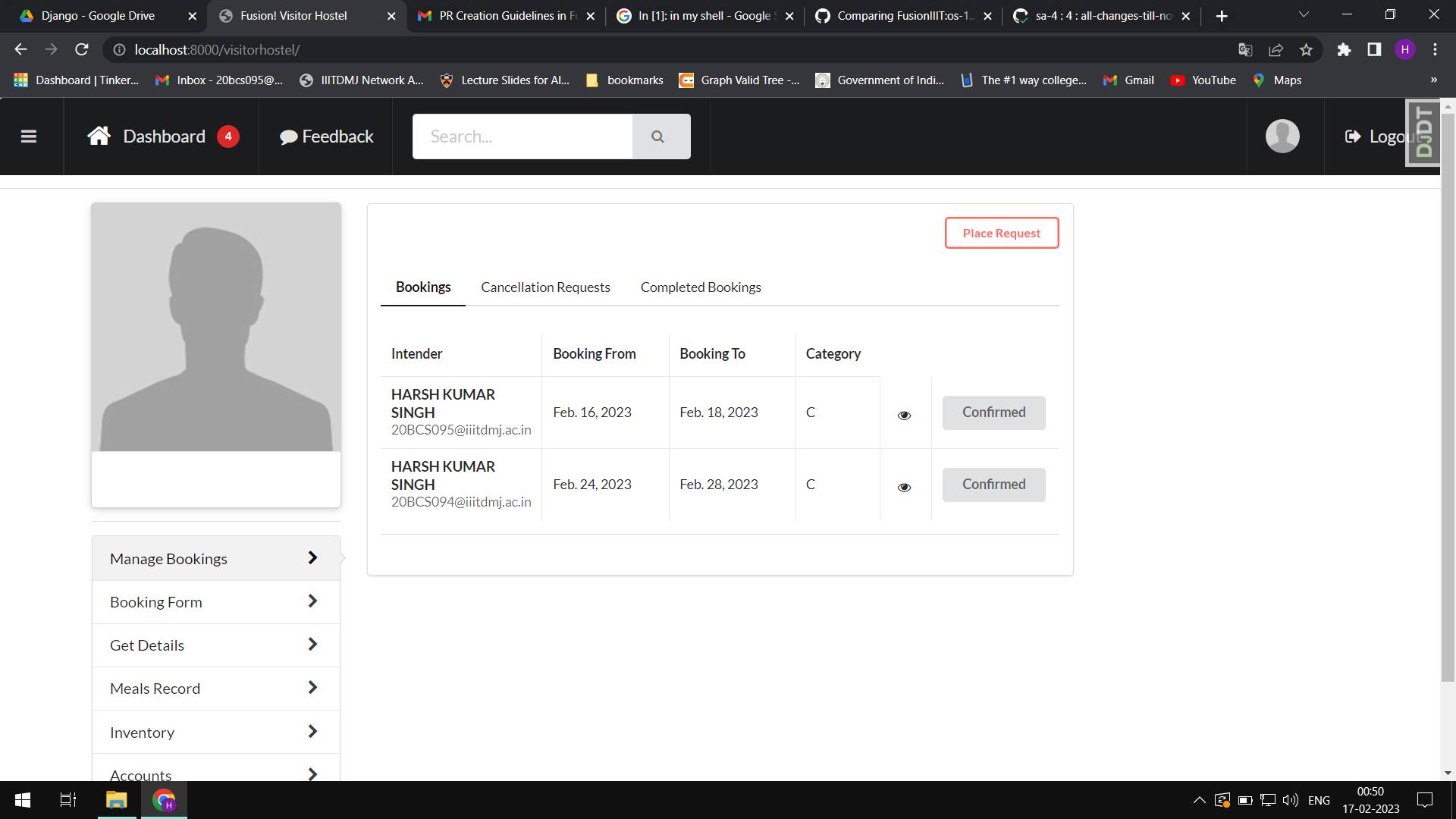 * OS1 issue 1024 resolved : Booking form integrated with Front End (#1025) * Enabled all modules for access (#1120) * OS-1 : Week 5 : All changes till week 5 (#1116) * Added start date display in pre registration (#1063) * Major changes in Visitor's Hostel --------- Co-authored-by: A Anunaya <76819712+Anunaya07@users.noreply.github.com> * OS-1 Minor issues resolved (#1202) * Booking form integrated with Front End * OS-1 week 7 issue resolve * Bill structured properly, updated room availability, meal record fixed, url fixed * Indentaion problems fixed * database changed * More indentations issues resolved * More indentations issues resolved * Next button issue resolved * Database Changed, inventory functionality added * Database conflict resolved * Minor issues resolved * Final changes made --------- Co-authored-by: Akshat Nema <76521428+akshatnema@users.noreply.github.com> * visitor hostel * os-1 vh complete * os-1 vh module * GAD-5: Fix responsiveness (#1125) Co-authored-by: A Anunaya <76819712+Anunaya07@users.noreply.github.com> Co-authored-by: Aksh Bansal <63552235+Aksh-Bansal-dev@users.noreply.github.com> * refactored and corrected booking issues * GAD -5 Dashboard Changes (#1325) * dashboard and usercard updated (#1329) * added form * Fixing ui bugs (#1335) --------- Co-authored-by: Harshvardhan Singh <73544247+Lawful2002@users.noreply.github.com> Co-authored-by: A Anunaya <76819712+Anunaya07@users.noreply.github.com> Co-authored-by: Aksh Bansal <63552235+Aksh-Bansal-dev@users.noreply.github.com> Co-authored-by: akshatnema <20bcs022@iiitdmj.ac.in> Co-authored-by: BlackHAWK2001 <150950834+BlackHAWK2001@users.noreply.github.com> Co-authored-by: Arpit Tak <140220904+Ishu-ji@users.noreply.github.com> Co-authored-by: SukulSarve <143542658+SukulSarve@users.noreply.github.com> --------- Co-authored-by: VedantJain1103 <105827483+VedantJain1103@users.noreply.github.com> Co-authored-by: Yathartha Goenka <75240973+yatharthagoenka@users.noreply.github.com> Co-authored-by: akshatnema <20bcs022@iiitdmj.ac.in> Co-authored-by: harsh-k-singh <105146460+harsh-k-singh@users.noreply.github.com> Co-authored-by: A Anunaya <76819712+Anunaya07@users.noreply.github.com> Co-authored-by: Akshat Nema <76521428+akshatnema@users.noreply.github.com> Co-authored-by: davneesh <avneeshd09@gmail.com> Co-authored-by: Avneesh <97170838+davneesh@users.noreply.github.com> Co-authored-by: Raman Chaudhary <97114586+ChaudharyRaman@users.noreply.github.com> Co-authored-by: varunraj03 <113377182+varunraj03@users.noreply.github.com> Co-authored-by: Harshvardhan Singh <73544247+Lawful2002@users.noreply.github.com> Co-authored-by: Aksh Bansal <63552235+Aksh-Bansal-dev@users.noreply.github.com> Co-authored-by: BlackHAWK2001 <150950834+BlackHAWK2001@users.noreply.github.com> Co-authored-by: Arpit Tak <140220904+Ishu-ji@users.noreply.github.com> Co-authored-by: SukulSarve <143542658+SukulSarve@users.noreply.github.com>