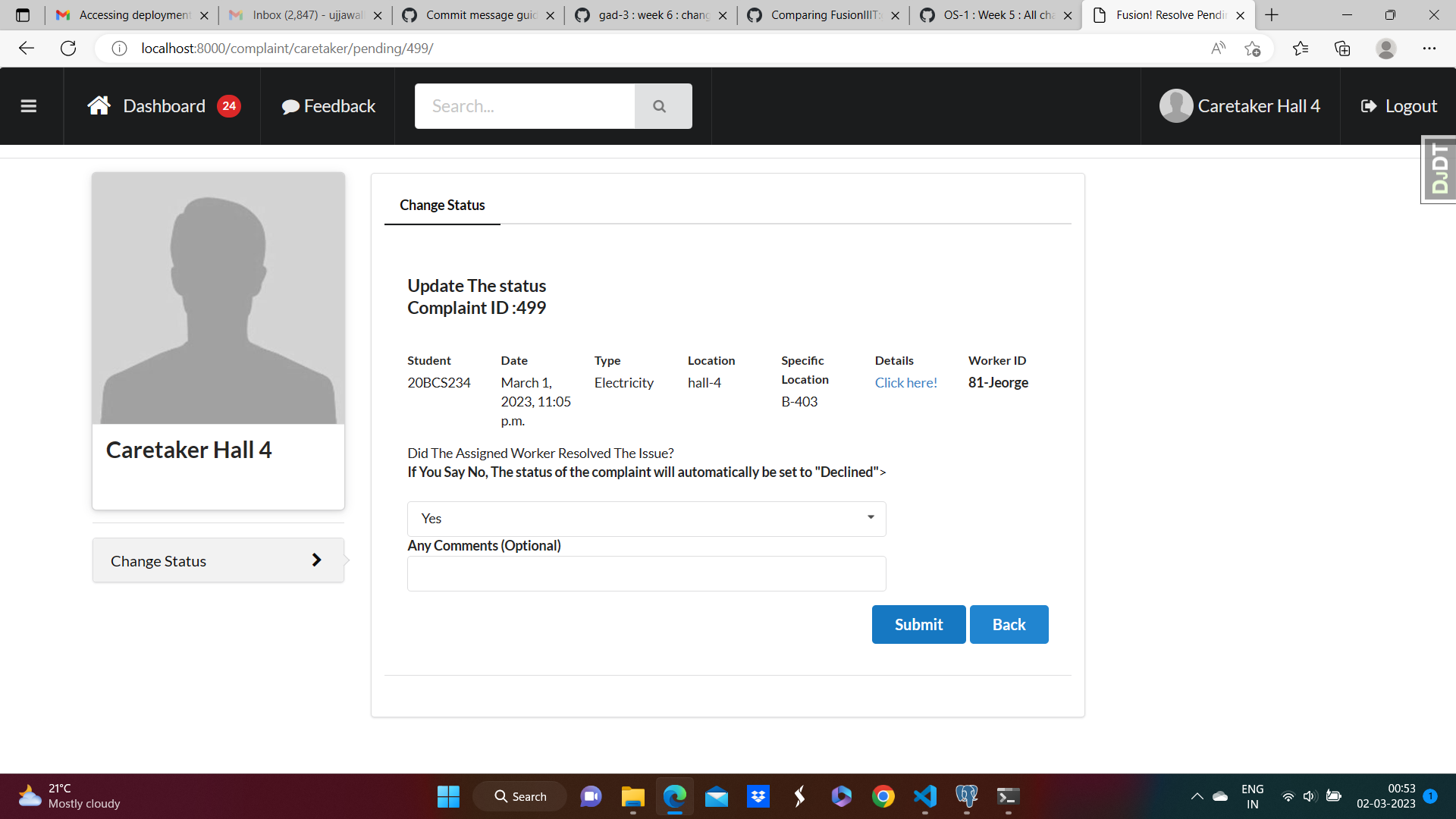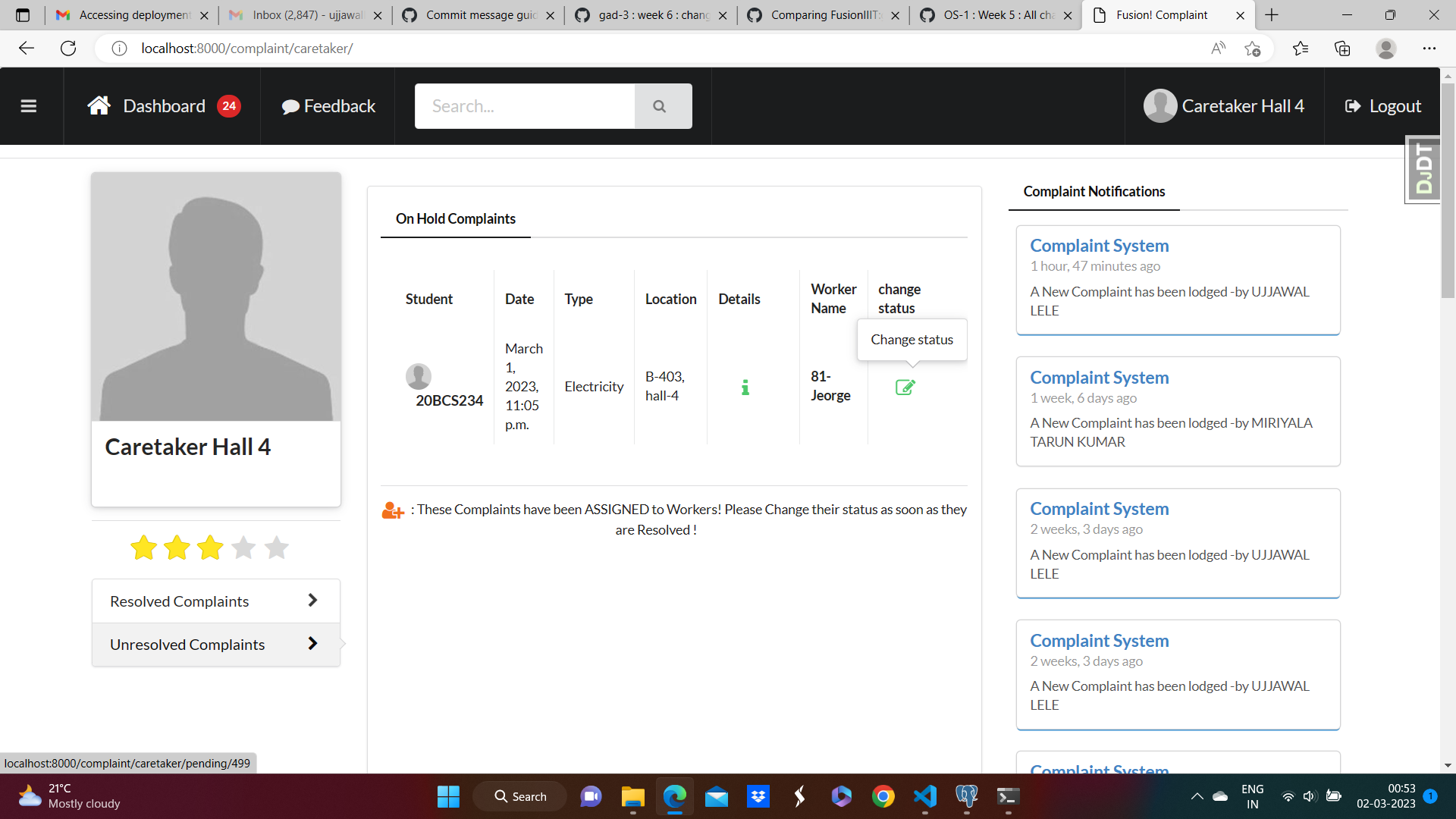 * gad-3 : week-2 : changed api functions (#1069) * gad-3 : workers would be assigned by Section Incharge instead of Caretaker (#1132) Co-authored-by: Akshat Nema <76521428+akshatnema@users.noreply.github.com> * gad-3: Week7 : fixed the notification and re-assign worker button issues (#1137) Co-authored-by: Aksh Bansal <63552235+Aksh-Bansal-dev@users.noreply.github.com> * auto-restart docker (#1147) * gad-3 : week-8 : db migrations after adding Section Incharge (#1173) * before adding functionality for secincharge * Delete 0002_auto_20230321_0041.py * gad-3 : week8 : remove wrong dependency to globals. (#1178) * Gad 3 (#1383) * GAD-5: Fix responsiveness (#1125) Co-authored-by: A Anunaya <76819712+Anunaya07@users.noreply.github.com> Co-authored-by: Aksh Bansal <63552235+Aksh-Bansal-dev@users.noreply.github.com> * Minor changes * Implementation of FTS and completion of the redirect functionality * Change in model of supervisor * Complition of redirect functionality and pagination * Fixation of a error * Completion of module * GAD -5 Dashboard Changes (#1325) * dashboard and usercard updated (#1329) * Fixing ui bugs (#1335) * Integrated dashborad * creating new branch * disallowing migrations * removing migration files --------- Co-authored-by: Harshvardhan Singh <73544247+Lawful2002@users.noreply.github.com> Co-authored-by: A Anunaya <76819712+Anunaya07@users.noreply.github.com> Co-authored-by: Aksh Bansal <63552235+Aksh-Bansal-dev@users.noreply.github.com> Co-authored-by: akshatnema <20bcs022@iiitdmj.ac.in> Co-authored-by: BlackHAWK2001 <150950834+BlackHAWK2001@users.noreply.github.com> Co-authored-by: Arpit Tak <140220904+Ishu-ji@users.noreply.github.com> Co-authored-by: SukulSarve <143542658+SukulSarve@users.noreply.github.com> * Gad-3 : fixed minor issues (#1389) * GAD-5: Fix responsiveness (#1125) Co-authored-by: A Anunaya <76819712+Anunaya07@users.noreply.github.com> Co-authored-by: Aksh Bansal <63552235+Aksh-Bansal-dev@users.noreply.github.com> * Minor changes * Implementation of FTS and completion of the redirect functionality * Change in model of supervisor * Complition of redirect functionality and pagination * Fixation of a error * Completion of module * GAD -5 Dashboard Changes (#1325) * dashboard and usercard updated (#1329) * Fixing ui bugs (#1335) * Integrated dashborad * creating new branch * disallowing migrations * removing migration files * resolved errors --------- Co-authored-by: Harshvardhan Singh <73544247+Lawful2002@users.noreply.github.com> Co-authored-by: A Anunaya <76819712+Anunaya07@users.noreply.github.com> Co-authored-by: Aksh Bansal <63552235+Aksh-Bansal-dev@users.noreply.github.com> Co-authored-by: akshatnema <20bcs022@iiitdmj.ac.in> Co-authored-by: BlackHAWK2001 <150950834+BlackHAWK2001@users.noreply.github.com> Co-authored-by: Arpit Tak <140220904+Ishu-ji@users.noreply.github.com> Co-authored-by: SukulSarve <143542658+SukulSarve@users.noreply.github.com> * Gad 3 complaint (#1390) * GAD-5: Fix responsiveness (#1125) Co-authored-by: A Anunaya <76819712+Anunaya07@users.noreply.github.com> Co-authored-by: Aksh Bansal <63552235+Aksh-Bansal-dev@users.noreply.github.com> * Minor changes * Implementation of FTS and completion of the redirect functionality * Change in model of supervisor * Complition of redirect functionality and pagination * Fixation of a error * Completion of module * GAD -5 Dashboard Changes (#1325) * dashboard and usercard updated (#1329) * Fixing ui bugs (#1335) * Integrated dashborad * creating new branch * disallowing migrations * removing migration files * resolved errors --------- Co-authored-by: Harshvardhan Singh <73544247+Lawful2002@users.noreply.github.com> Co-authored-by: A Anunaya <76819712+Anunaya07@users.noreply.github.com> Co-authored-by: Aksh Bansal <63552235+Aksh-Bansal-dev@users.noreply.github.com> Co-authored-by: akshatnema <20bcs022@iiitdmj.ac.in> Co-authored-by: BlackHAWK2001 <150950834+BlackHAWK2001@users.noreply.github.com> Co-authored-by: Arpit Tak <140220904+Ishu-ji@users.noreply.github.com> Co-authored-by: SukulSarve <143542658+SukulSarve@users.noreply.github.com> * Gad 3 complaint (#1391) * GAD-5: Fix responsiveness (#1125) Co-authored-by: A Anunaya <76819712+Anunaya07@users.noreply.github.com> Co-authored-by: Aksh Bansal <63552235+Aksh-Bansal-dev@users.noreply.github.com> * Minor changes * Implementation of FTS and completion of the redirect functionality * Change in model of supervisor * Complition of redirect functionality and pagination * Fixation of a error * Completion of module * GAD -5 Dashboard Changes (#1325) * dashboard and usercard updated (#1329) * Fixing ui bugs (#1335) * Integrated dashborad * creating new branch * disallowing migrations * removing migration files * resolved errors * resolved error --------- Co-authored-by: Harshvardhan Singh <73544247+Lawful2002@users.noreply.github.com> Co-authored-by: A Anunaya <76819712+Anunaya07@users.noreply.github.com> Co-authored-by: Aksh Bansal <63552235+Aksh-Bansal-dev@users.noreply.github.com> Co-authored-by: akshatnema <20bcs022@iiitdmj.ac.in> Co-authored-by: BlackHAWK2001 <150950834+BlackHAWK2001@users.noreply.github.com> Co-authored-by: Arpit Tak <140220904+Ishu-ji@users.noreply.github.com> Co-authored-by: SukulSarve <143542658+SukulSarve@users.noreply.github.com> * merged staging into gad-3 --------- Co-authored-by: ujjawallele13 <111732396+ujjawallele13@users.noreply.github.com> Co-authored-by: akshatnema <20bcs022@iiitdmj.ac.in> Co-authored-by: Akshat Nema <76521428+akshatnema@users.noreply.github.com> Co-authored-by: Aksh Bansal <63552235+Aksh-Bansal-dev@users.noreply.github.com> Co-authored-by: nidhibarapatre <116302859+nidhibarapatre@users.noreply.github.com> Co-authored-by: Harshvardhan Singh <73544247+Lawful2002@users.noreply.github.com> Co-authored-by: A Anunaya <76819712+Anunaya07@users.noreply.github.com> Co-authored-by: BlackHAWK2001 <150950834+BlackHAWK2001@users.noreply.github.com> Co-authored-by: Arpit Tak <140220904+Ishu-ji@users.noreply.gith