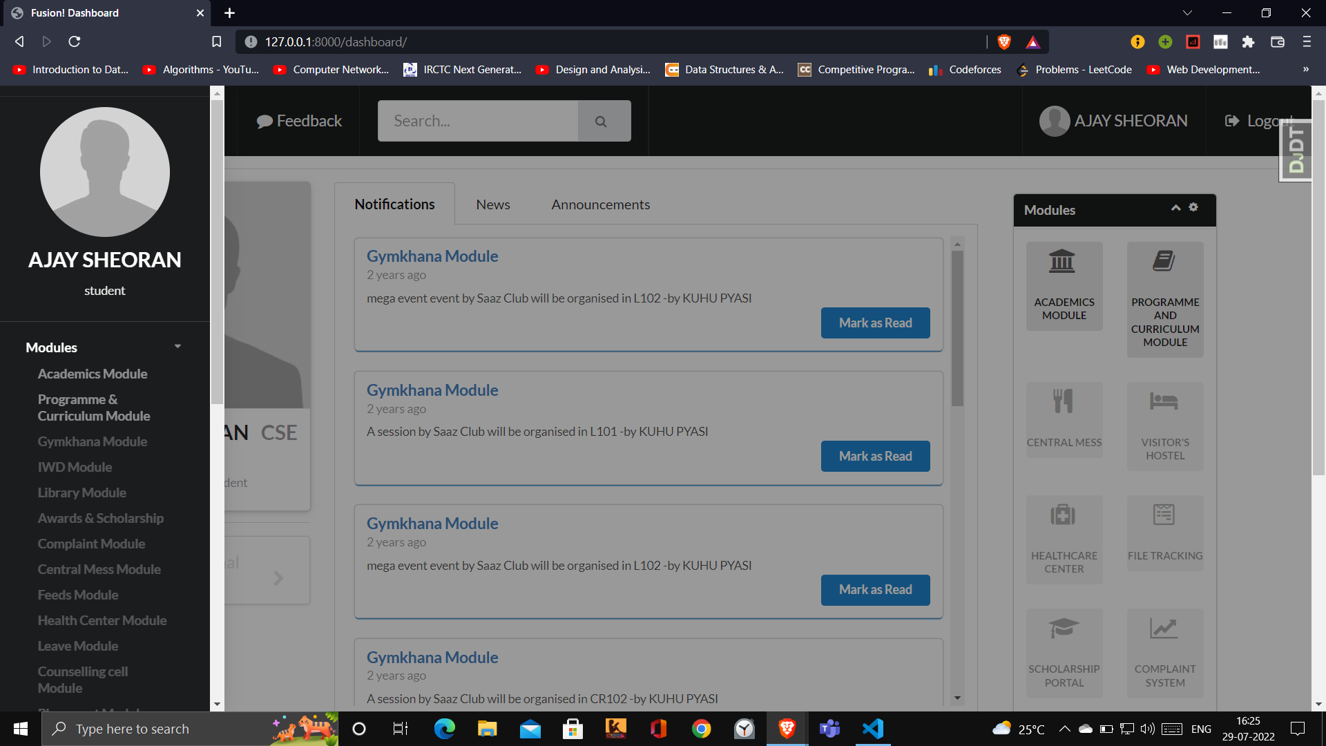 Disabled modules other than academics and Programme and curriculum module