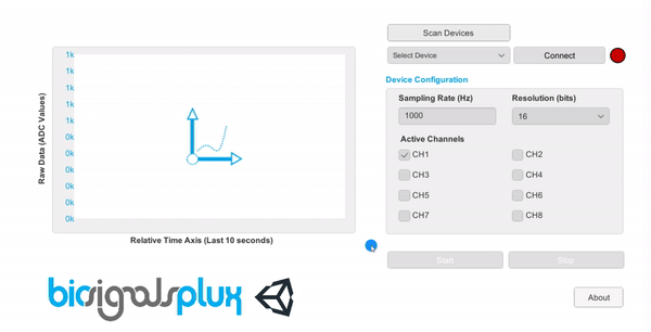 The Sample APP contained inside this repository provides a practical and intuitive resource to explore the integration of the signal acquisition devices commercialized by PLUX (biosignalsplux, BITalino...) with the powerful development environment of Unity.