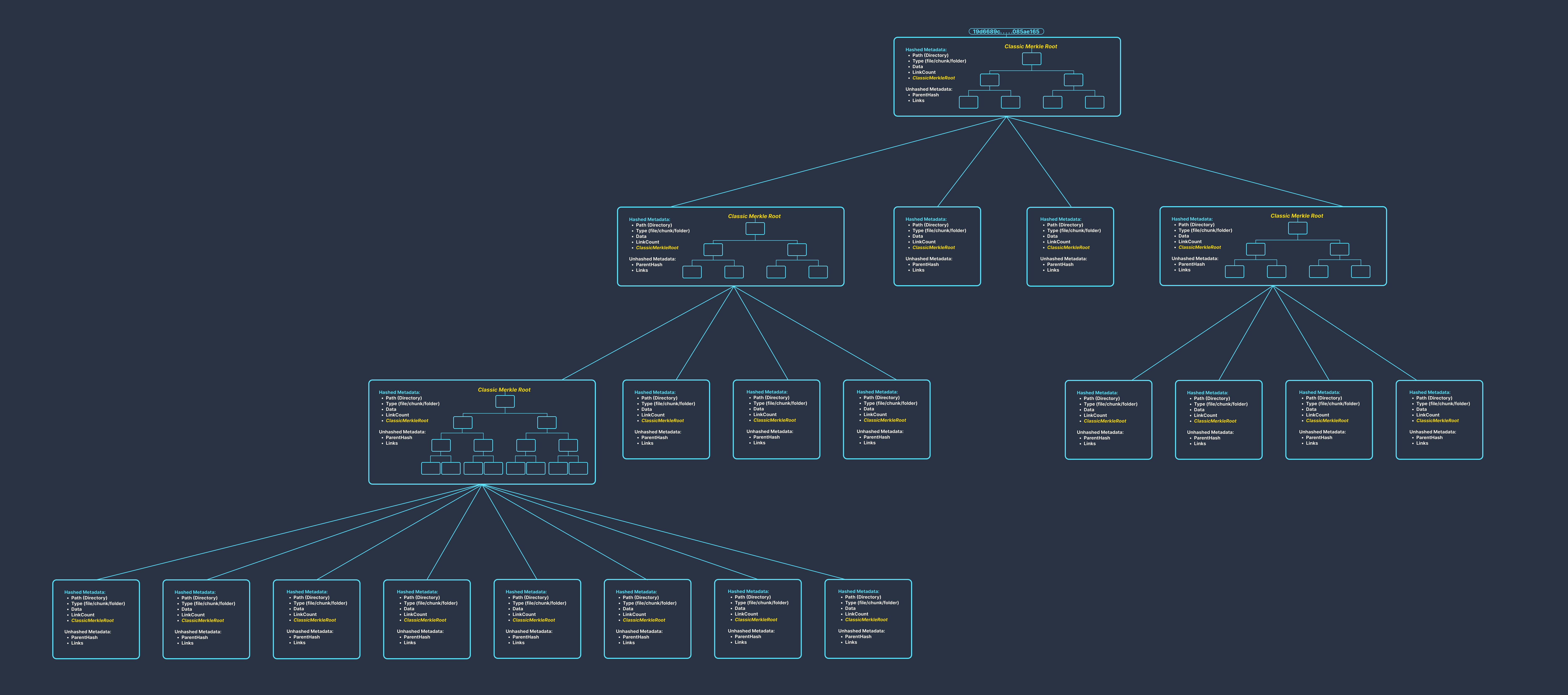 Within each parent leaf (folder), its list of hashes (chunks/children) are organized as a Classic Merkle Tree rather than a potentially large plaintext list of hashes. Large files or folders lead to many chunks, which can eventually lead to an extremely large lists of hashes. By ensuring the parent leaf is chunked with a Classic Merkle Tree, this scaling problem emerging from large amounts of data can be avoided.