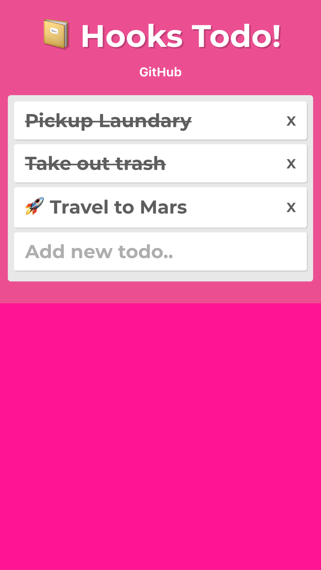 React Hooks Todo App 📝 Uses useState for managing todos and useEffect to save todos to localStorage Demo Demo Screenshots Contributors Contributions Welcome