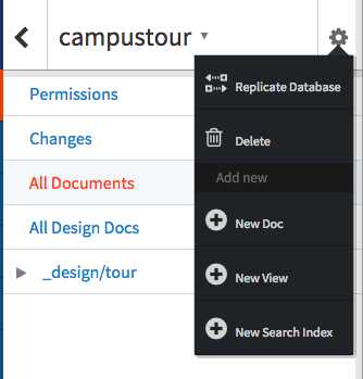 Setting up design documetns is also straightforward. Click on the gear symbol, then select "New View." You'll be prompted to enter a name for your design document. We recommend "_design/tour" though you can mutatis mutandis use any name you'd like. After selecting a name for your design document, select a name for your view–for example, "Tree" to select all the documents about trees. Finally, you'll need to write a map function.