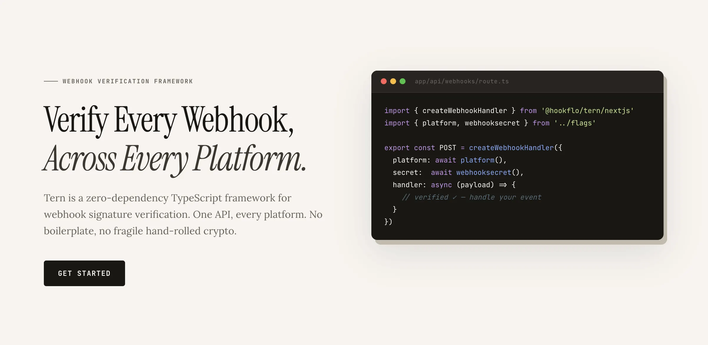 npm install @hookflo/ternThe same framework powering webhook verification at Hookflo.