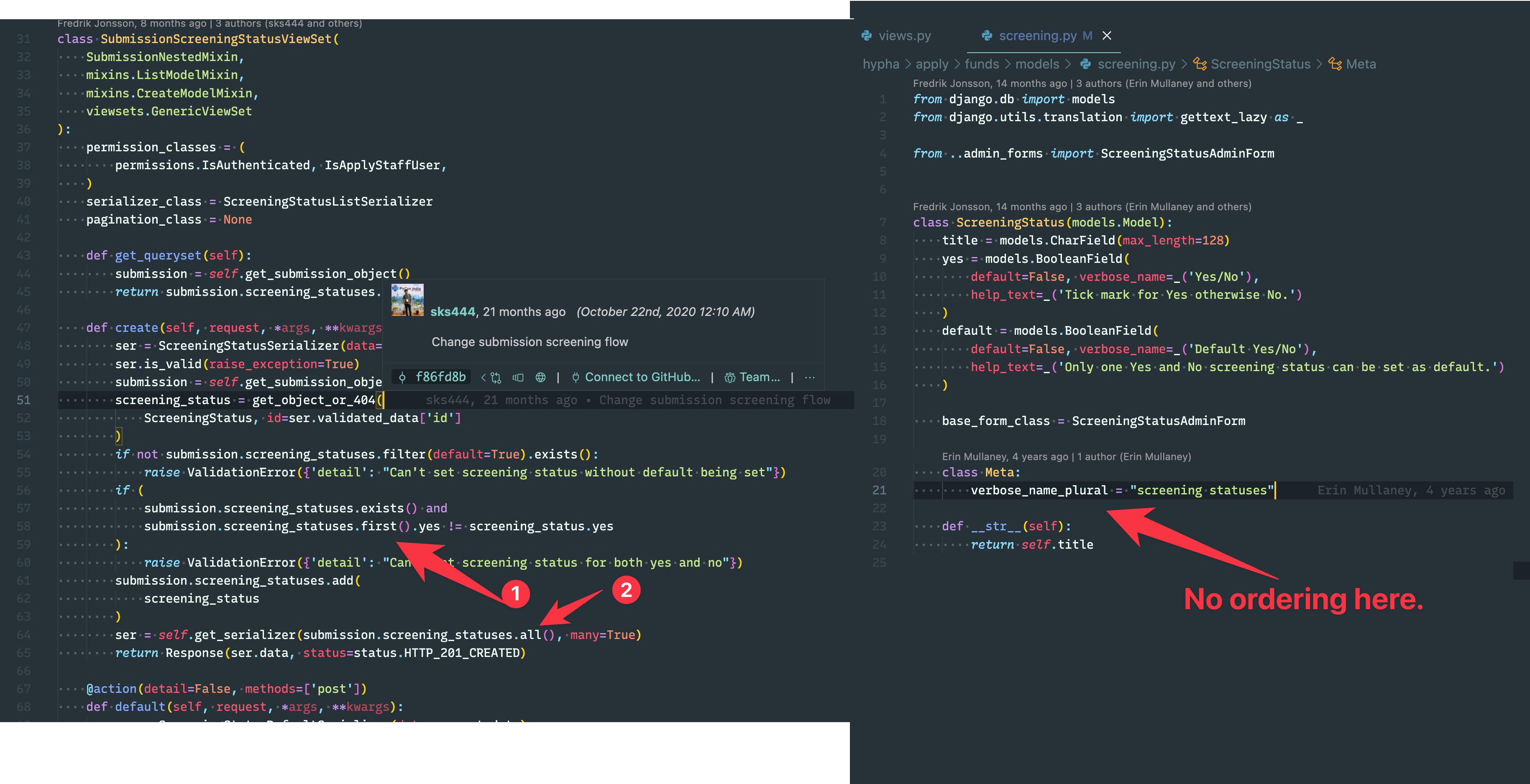 The test_add_screening_status is failing for me locally. The reason seems to be there is no pre-defined ordering on the tables, but you are expecting an I’m not sure how it’s passing in the circle CI, but it’s failing on my machine. @frjo @sandeepsajan0 |