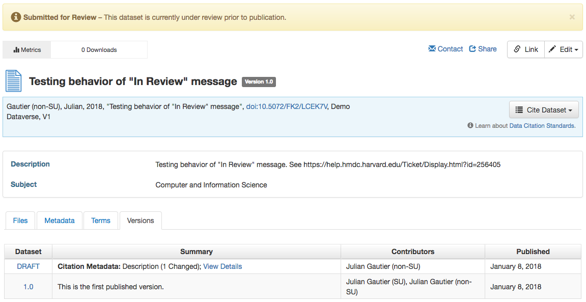- the depositor edits the dataset and submits a second version of the dataset for review