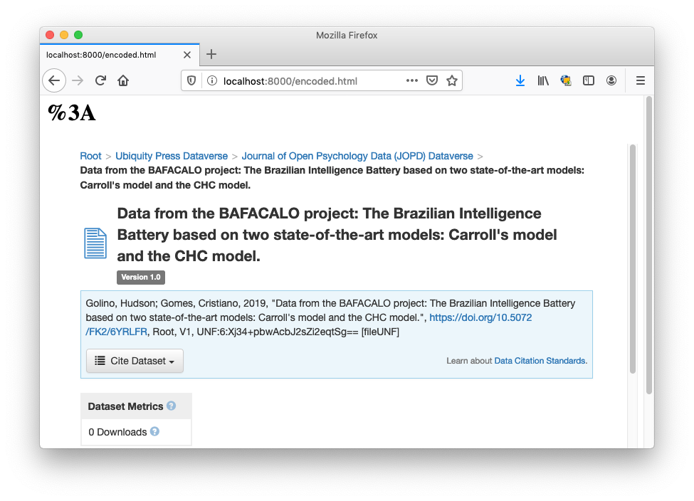 <script src="http://localhost:8080/resources/js/widgets.js?persistentId=doi:10.5072/FK2/6YRLFR&dvUrl=http://localhost:8080&widget=iframe&heightPx=500"</script>encoded colons
