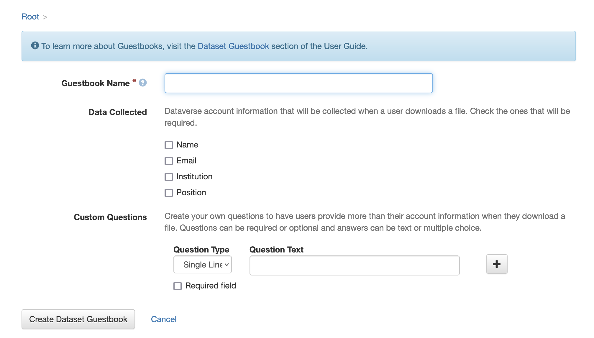 @pdurbin ideally dataset users do not see the Guestbook module unless there is a Guestbook (view terms while no guestbook is selected example). I recognize that might be out of scope. As is, the language is written for a data owner, and might be confusing to a data user. Let's discuss options. The button looks great! |