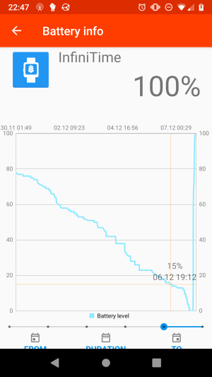 LowBatterymessage to the SystemTask that reacts by pushing a notification.I also updated the BatteryInfo settings screen to use the threshold to color its charging bar differently.