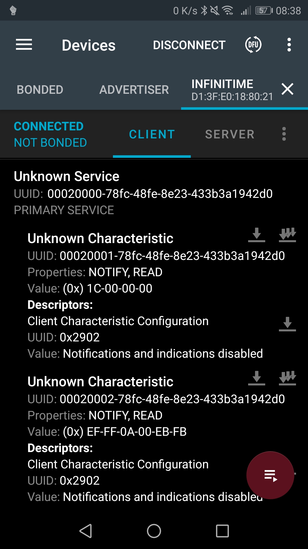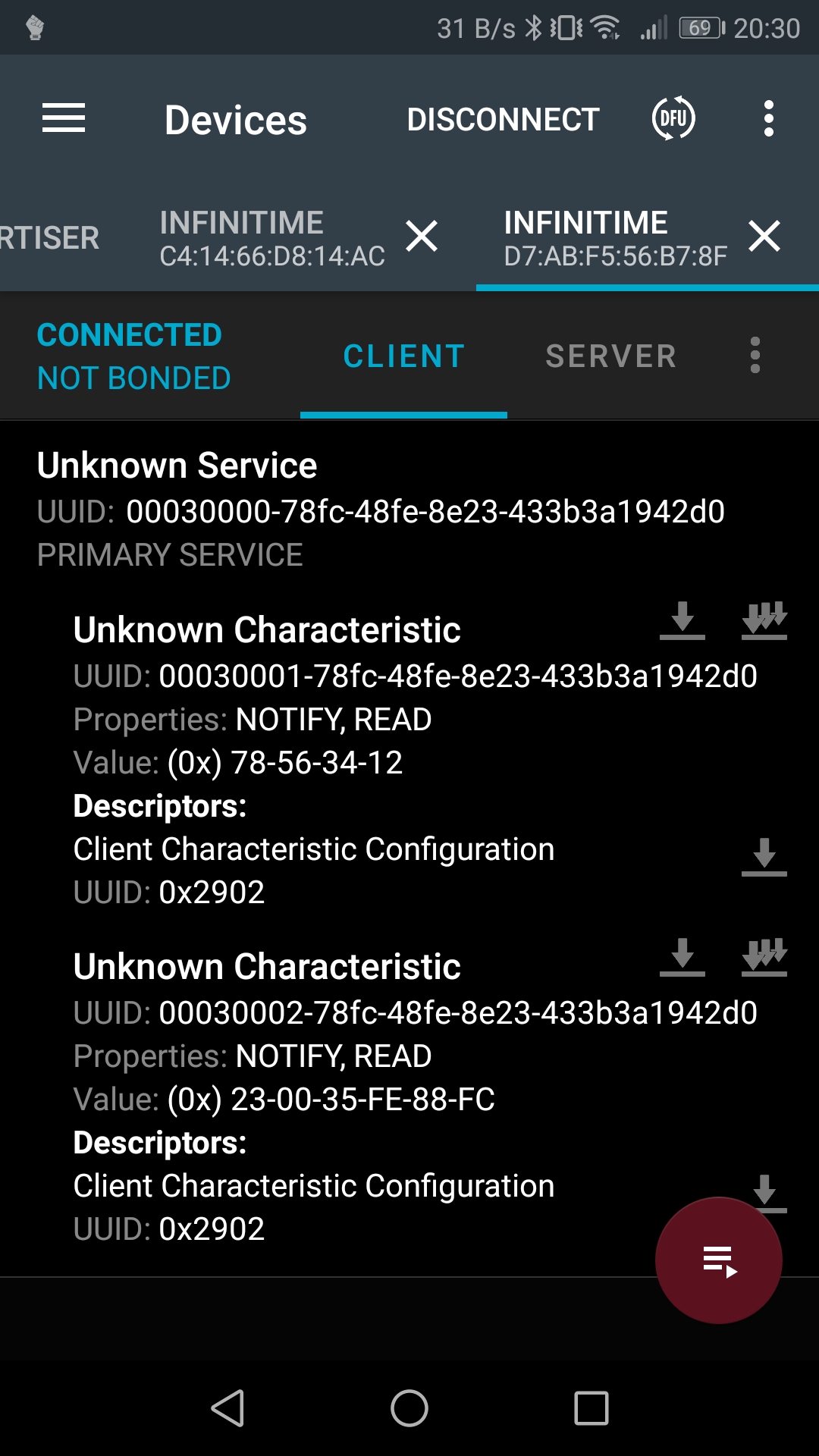 00020001-78fc-48fe-8e23-433b3a1942d000030001-78fc-48fe-8e23-433b3a1942d0 (READ/NOTIFY)00020002-78fc-48fe-8e23-433b3a1942d000030002-78fc-48fe-8e23-433b3a1942d0 (READ/NOTIFY)I also improved notifications so that they are processed and send only if the companion app registered to them (and applied to change to the heart rate service).