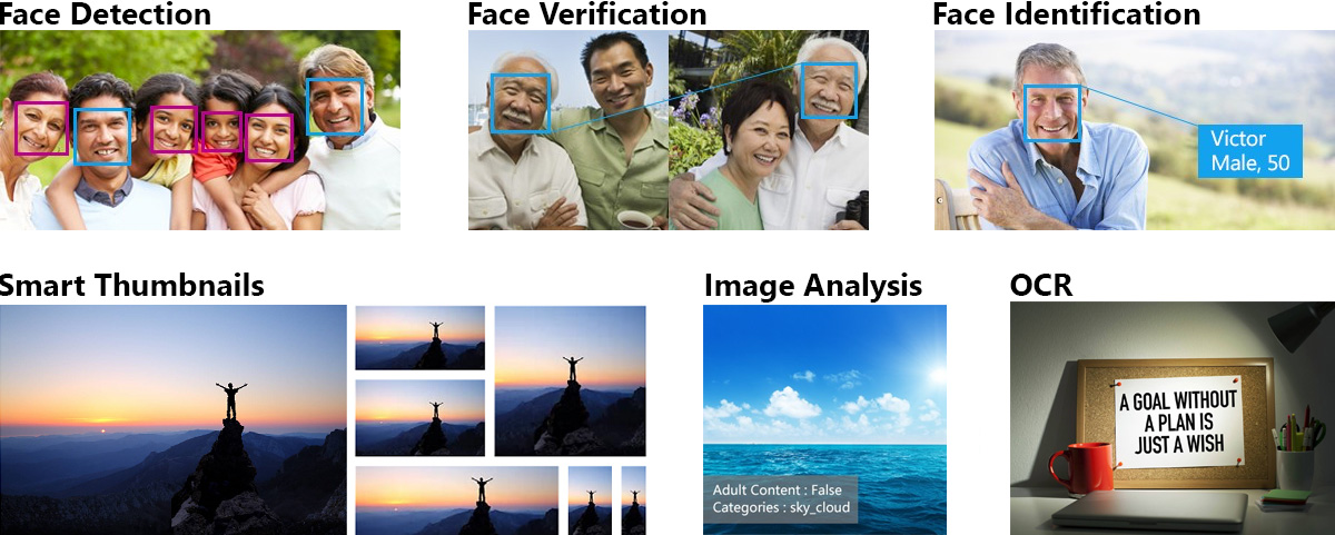This package contains a set of intelligent APIs understanding images: It can detect and analyze people's faces, their age, gender, and similarity. It can identify people based on a set of images. It can understand what is displayed in a picture and crop it according to where the important features are. It can tell you whether an image contains adult content, what the main colors are, and which of your images belong in a group. If your image features text, it will tell you the language and return the text as a string. It's basically magic. For more details on the Project Oxford API, please visit projectoxford.ai.