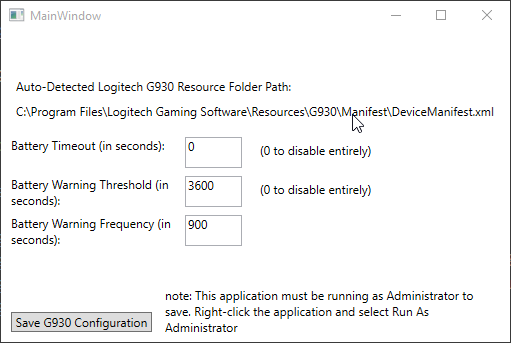 So, I wrote this simple program to help. It is a small Windows application which will help you view and modify the battery settings for your G930 headset used by the Logitech Gaming Software.