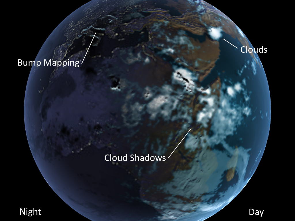 I implemented a rather basic cloud shadow technique for the globe. The logic behind these shadows is that the light (the lit part of the globe) should cast long visible shadows near the day-night borders, and nearly no visible shadows where the globe is closest to the light. You can see this in the image below.