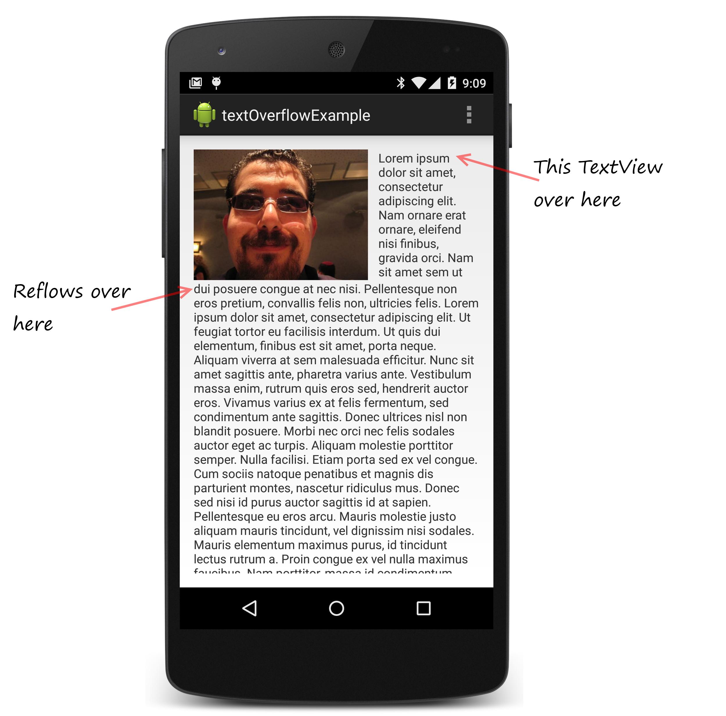 <net.justinangel.textoverflowexample.TextViewOverflowing android:text="Lorem ipsum dolor sit amet, consectetur adipiscing elit. Suspendisse id elit tempus, semper elit et, faucibus leo. Suspendisse urna urna, ornare in rutrum et, rhoncus sed risus." android:id="@+id/TextViewOverflowing" /> <TextView android:text="I'm overflow text placeholder" android:id="@+id/overflowTextView" /> -