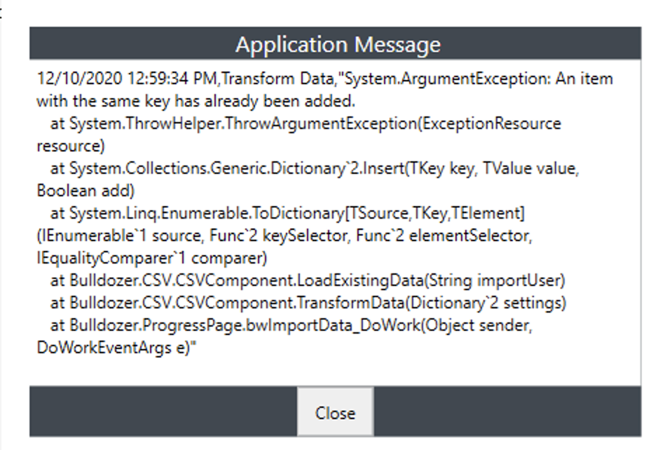 at System.Collections.Generic.Dictionary2.Insert(TKey key, TValue value, Boolean add) at System.Linq.Enumerable.ToDictionary[TSource,TKey,TElement](IEnumerable1 source, Func2 keySelector, Func2 elementSelector, IEqualityComparer1 comparer) at Bulldozer.CSV.CSVComponent.LoadExistingData(String importUser) at Bulldozer.CSV.CSVComponent.TransformData(Dictionary2 settings)