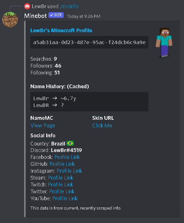 /mcinfo [nickname] - Gets information's of a Minecraft account.