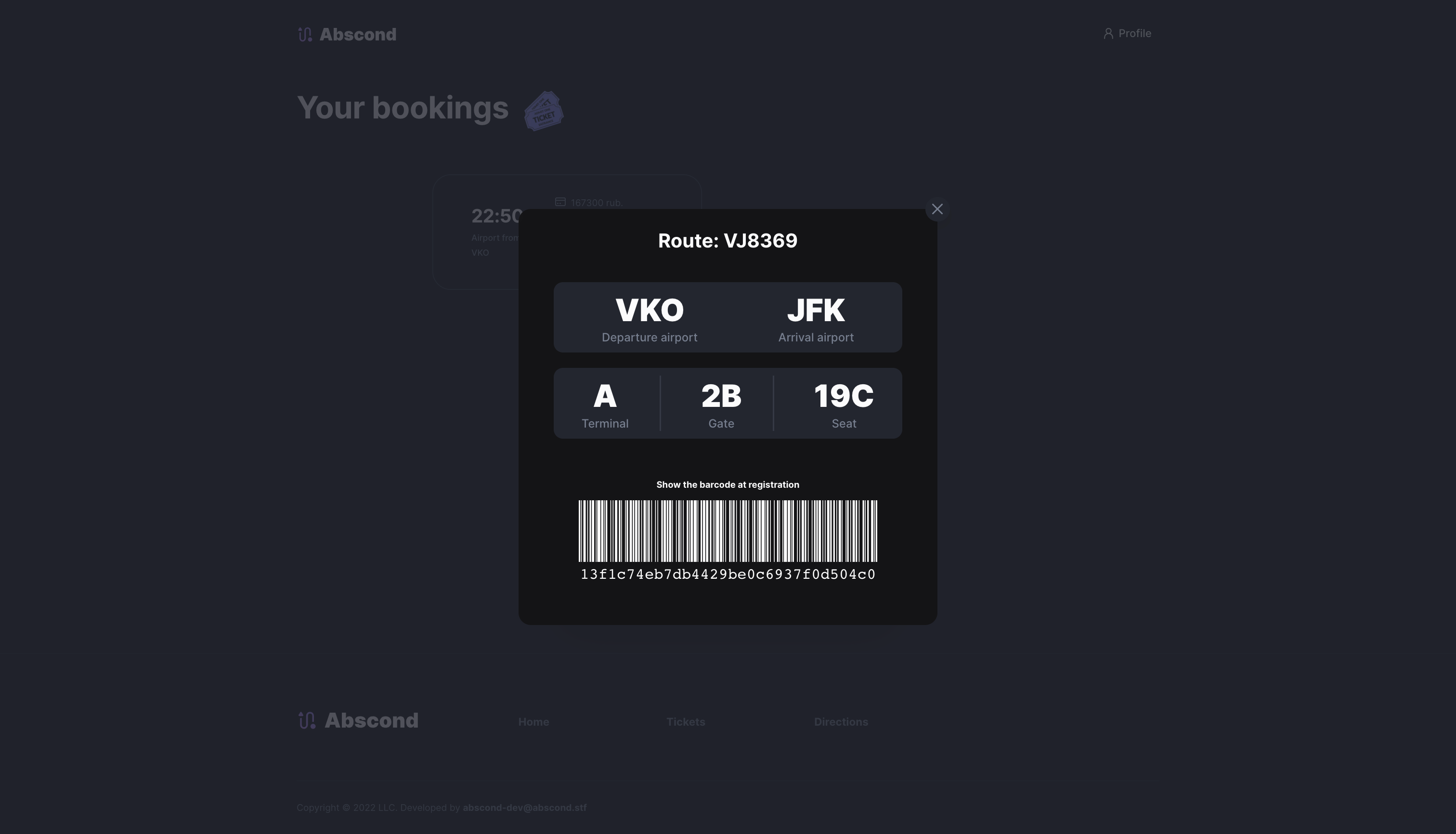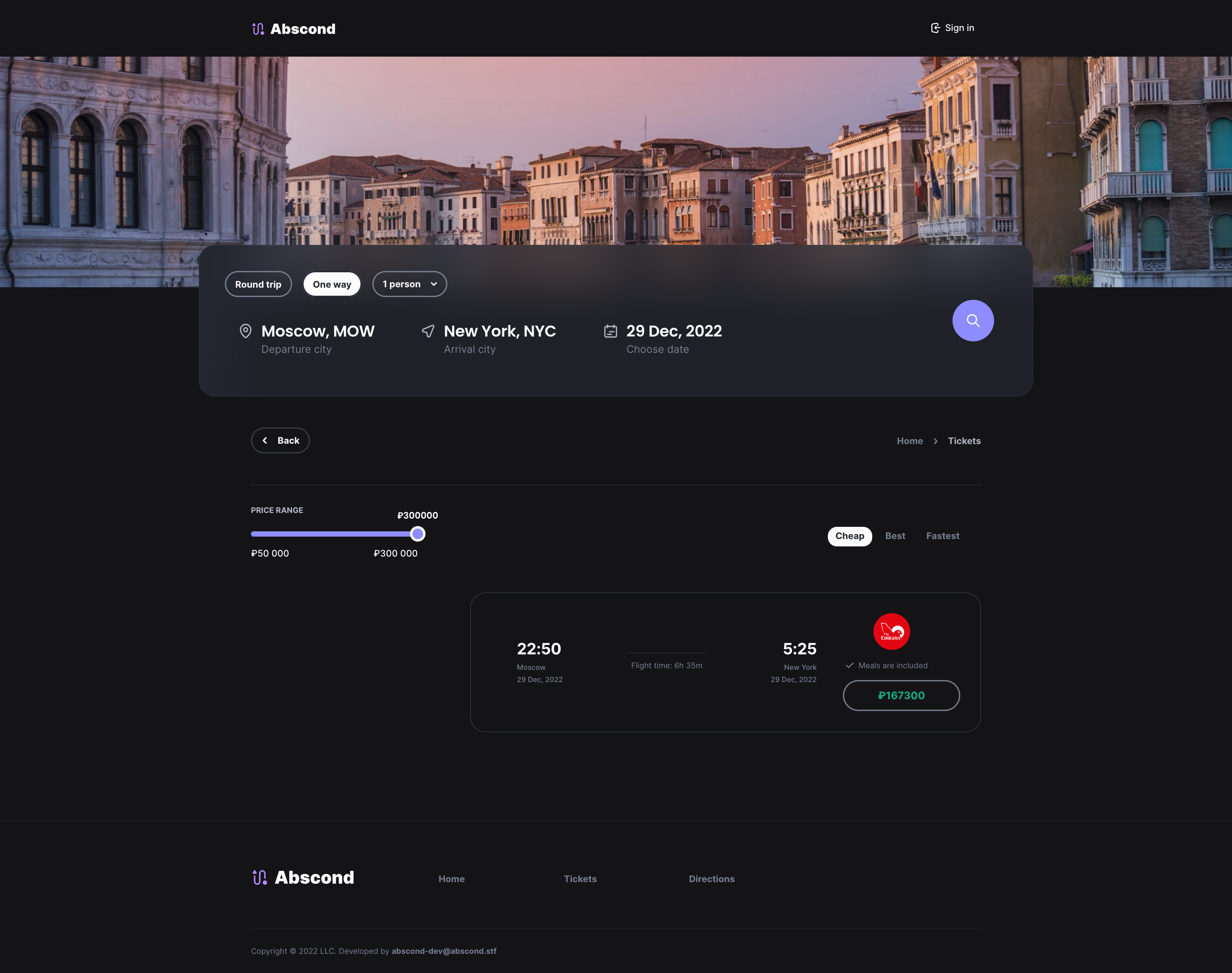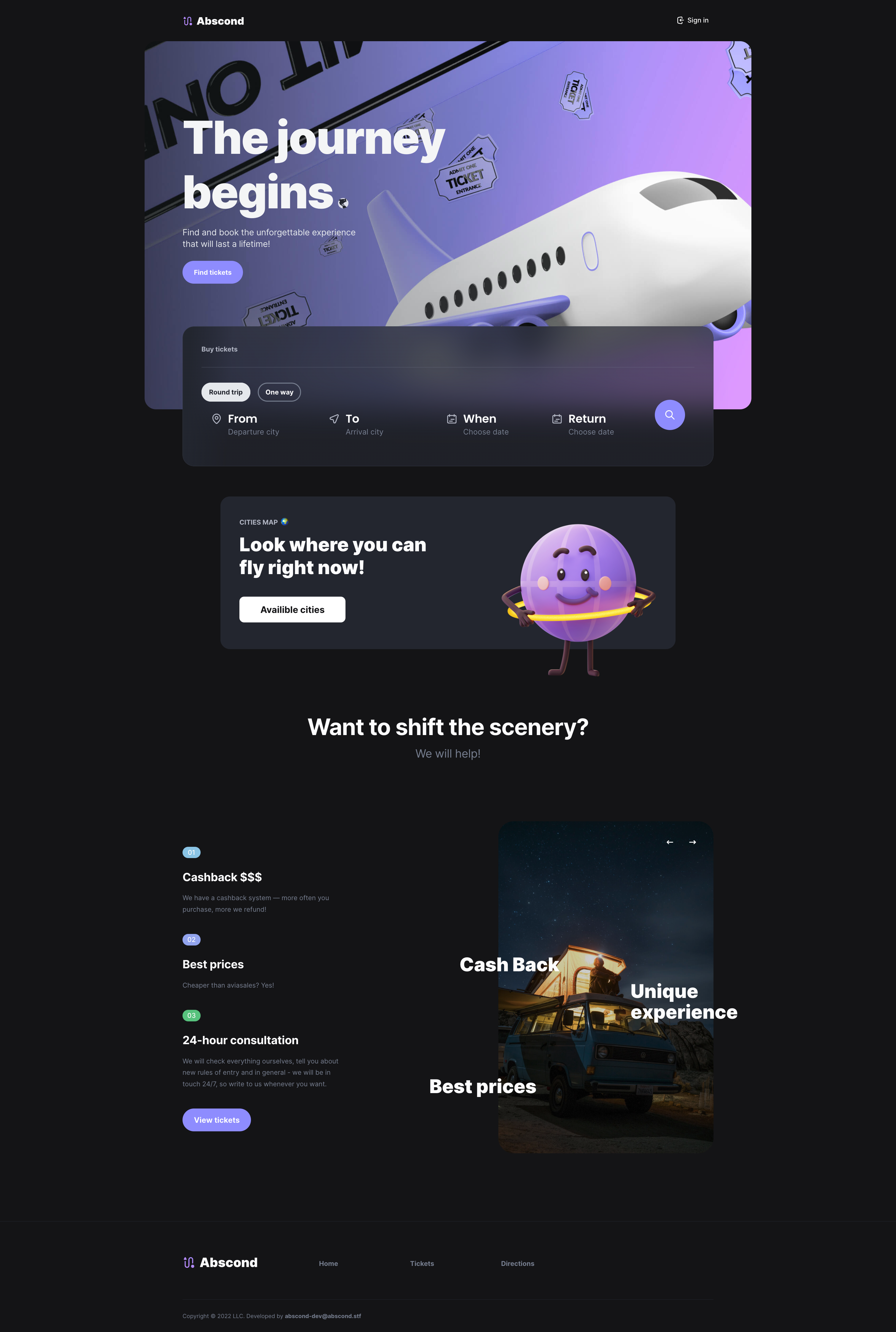Abscond — Airline tickets aggregator Dev stack Flask PostgreSQL Redis (For storing sessions) React & Redux Sass Screenshots 1. Home page 2. Buying ticket 3. Directions 4. Account 5. Manager registration 6. Fully adaptive