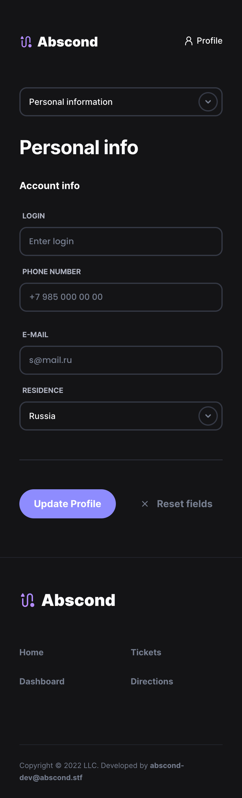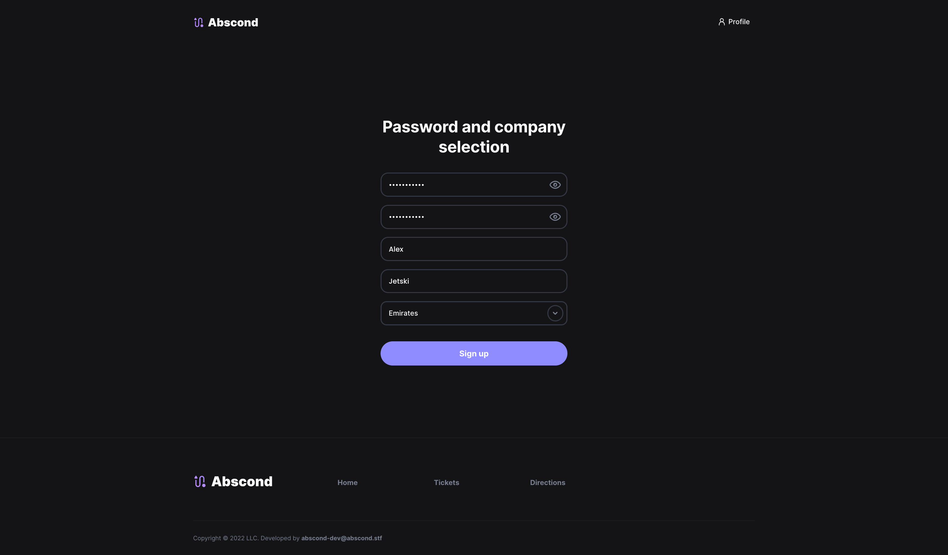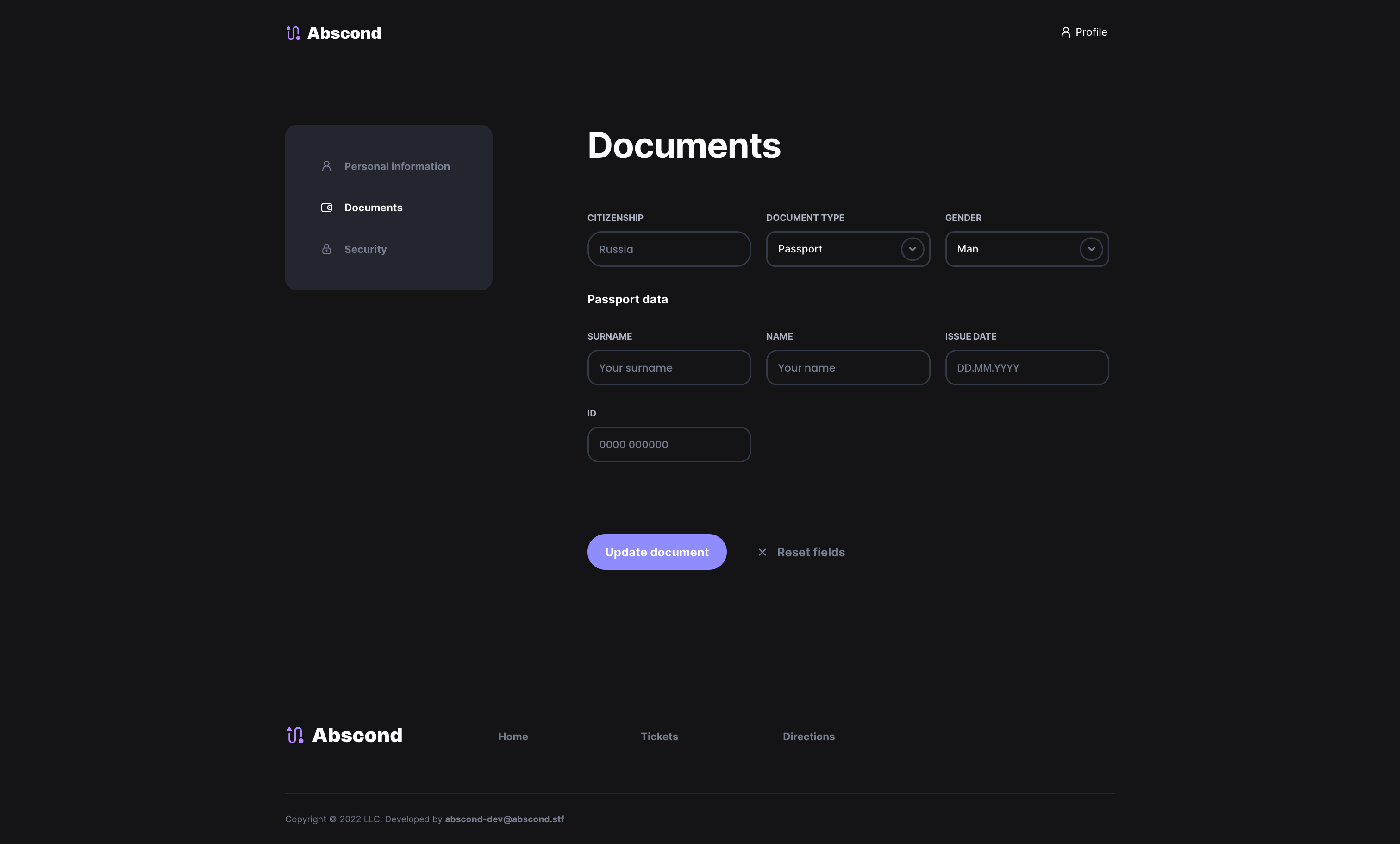 Abscond — Airline tickets aggregator Dev stack Flask PostgreSQL Redis (For storing sessions) React & Redux Sass Screenshots 1. Home page 2. Buying ticket 3. Directions 4. Account 5. Manager registration 6. Fully adaptive